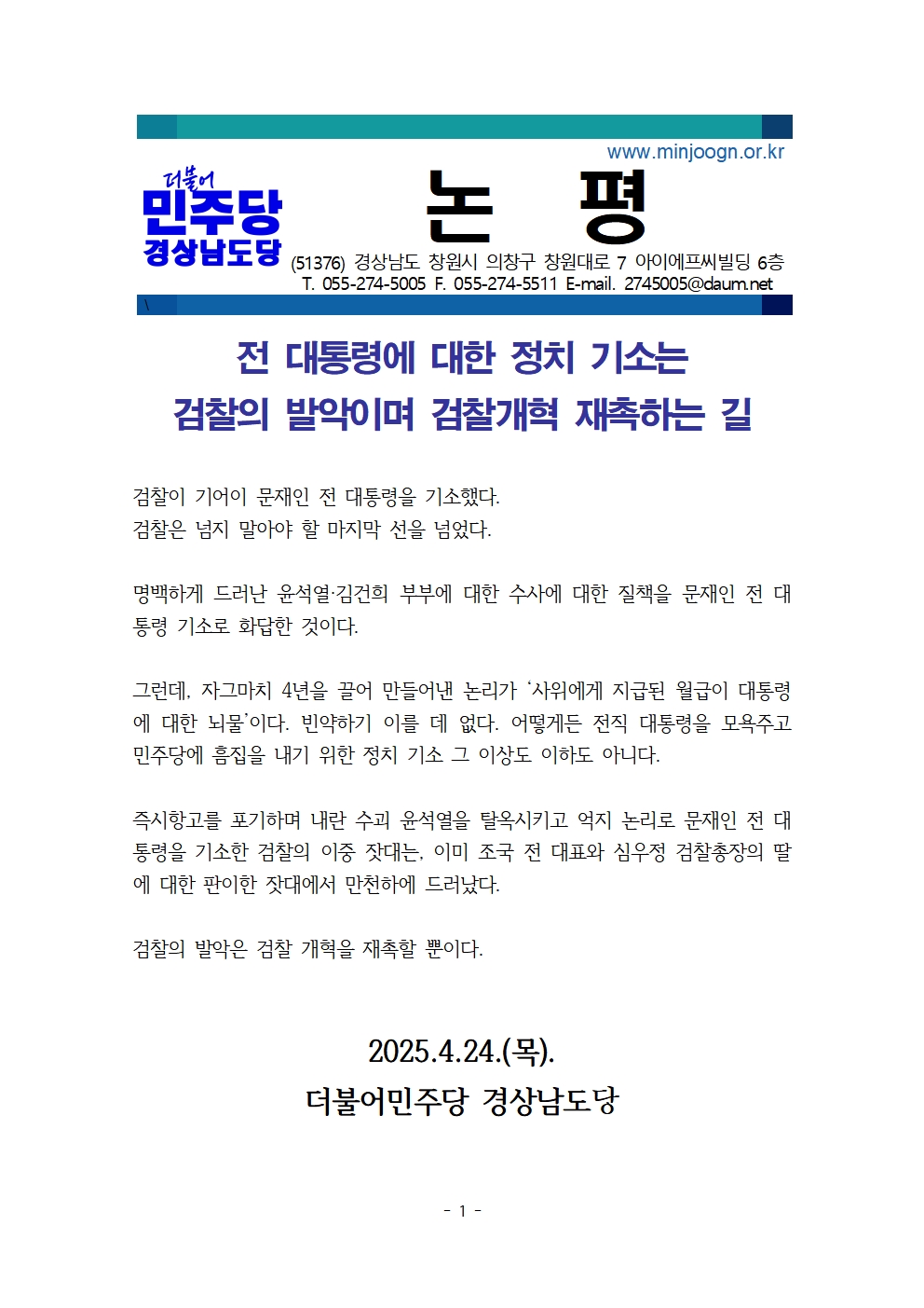 목, 2025/04/24- 00:00 에 admin 에 의해 제출됨 [0] 관련 개인/그룹 민주당 경남도당 정당 더불어민주당 지역 경남 카테고리 성명서/논평 링크 https://www.minjoogn.or.kr/sub02/sub03_01.php?code=020301&page=1&bbsData=&idx=850&search=&searchstring=&gubunx=&mode=view&m2= Like 0 Dislike 0 댓글 달기 이름 제목 Comment 저장 Preview