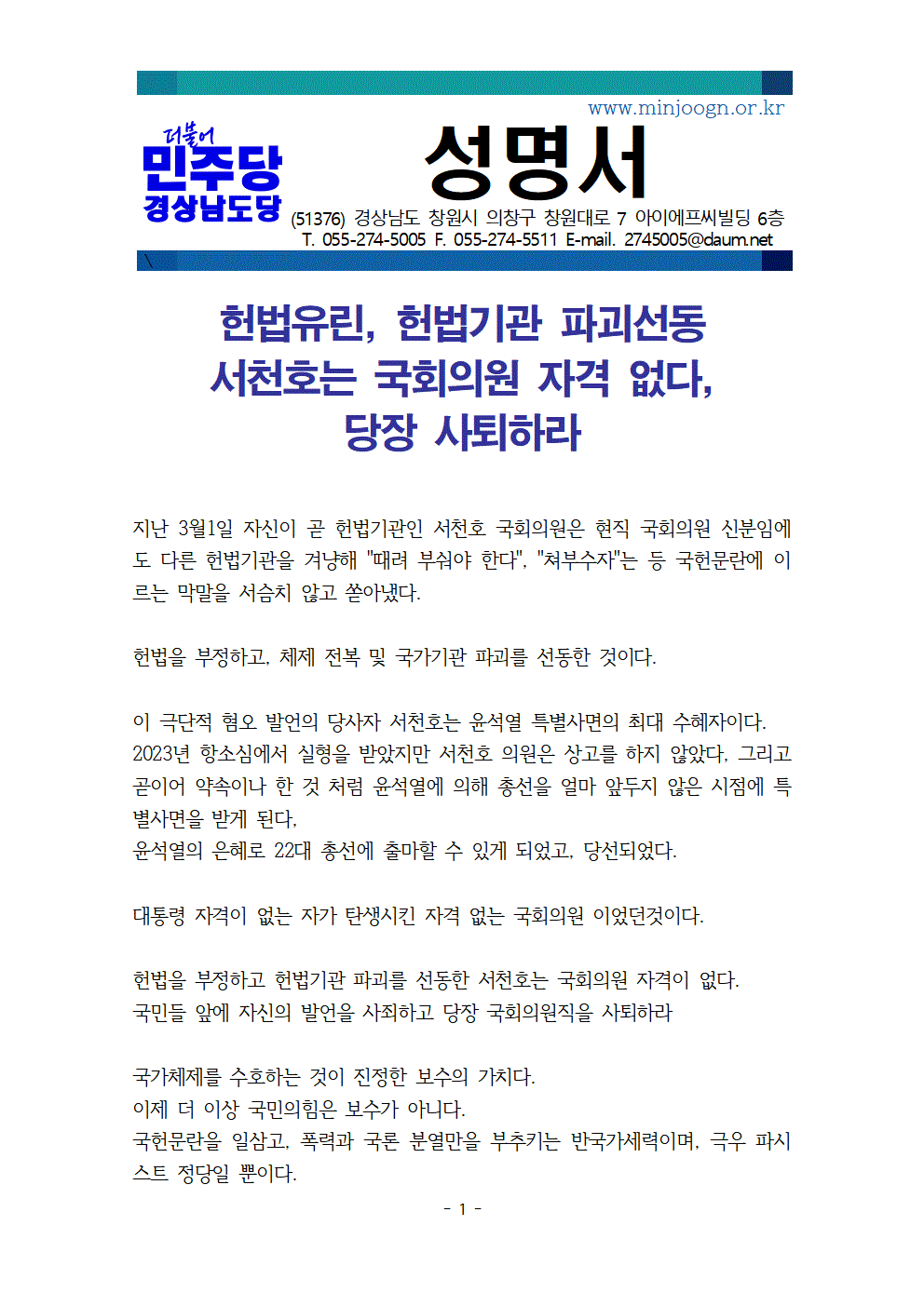 민주당 경남도당 - 성명서-헌법유린, 헙법기관 파괴선동 서천호는 사퇴하라!