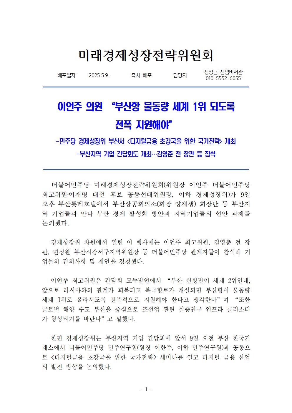 금, 2025/05/09- 00:00 에 admin 에 의해 제출됨 [0] 관련 개인/그룹 민주당 중앙당 정당 더불어민주당 지역 미특정 카테고리 보도자료 250509_보도자료_미래경제성장전략위_기업간담회+세미나부산.pdf공유 공유하기 닫기페이스북트위터카카오톡URL 복사 링크 https://theminjoo.kr/main/sub/news/view.php?sno=0&brd=188&post=1211174&search= Like 0 Dislike 0 댓글 달기 이름 제목 Comment 저장 Preview