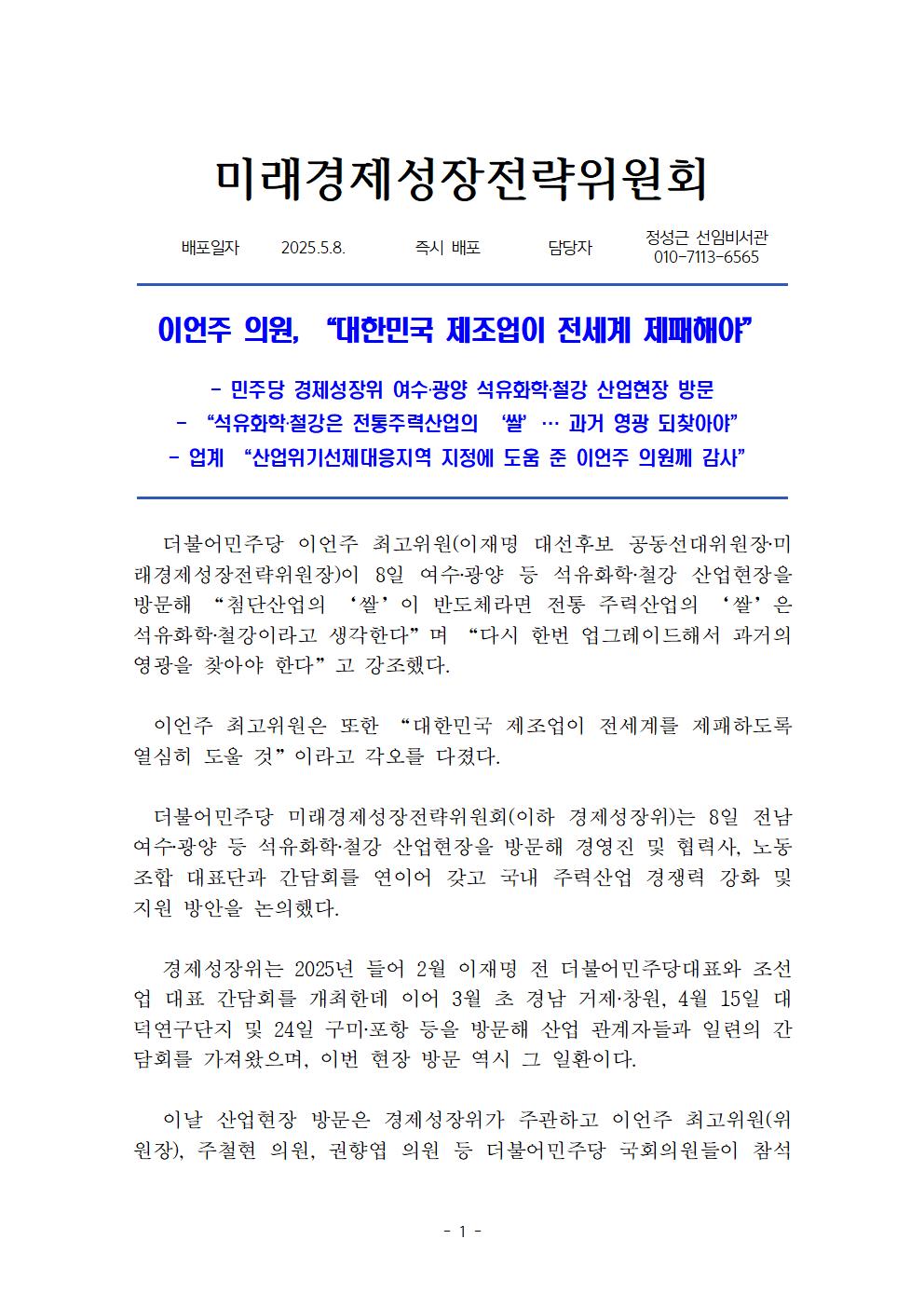 목, 2025/05/08- 00:00 에 admin 에 의해 제출됨 [0] 관련 개인/그룹 민주당 중앙당 정당 더불어민주당 지역 미특정 카테고리 보도자료 250424_보도자료_경제성장위_광양여수산업현장방문.pdf공유 공유하기 닫기페이스북트위터카카오톡URL 복사 링크 https://theminjoo.kr/main/sub/news/view.php?sno=0&brd=188&post=1211139&search= Like 0 Dislike 0 댓글 달기 이름 제목 Comment 저장 Preview