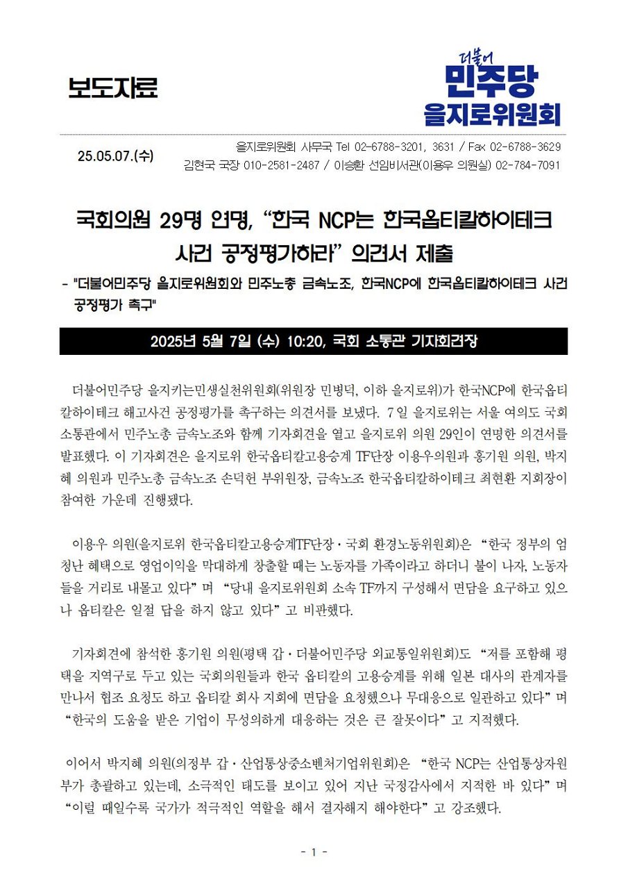 민주당 중앙당 - 더불어민주당 을지로위원회, 국회의원 29명 연명,“한국 NCP는 한국옵티칼하이테크 사건 공정평가하라” 의견서 제출