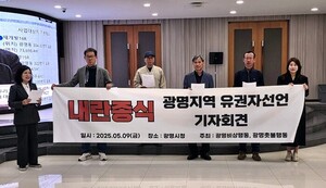 광명비상행동·광명촛불행동이 합동으로 기자회견을 갖고 “내란정당 국민의힘 해체와 대선 출마 철회”를 촉구하고 나서 주목. 지난 9일 오전 11시 광명시청 로비에서는 김혜민 광명촛불행동 상임대표의 사회로 이 열렸다. 이들은 기자회견문을 통해 “내란수괴 윤석열이 파면되고 조기 대선이 치러진다. 이번 조기 대선은 12.3 비상계엄 선포 이후 4개월 동안 촛불과 응원봉을 들고 내란수괴 윤석열 파면을 위해 싸워온 국민들이 만들어낸 선거다. 이번 대선에서 국민들의 목표는 민주정부 건설과 내란세력 청산이다