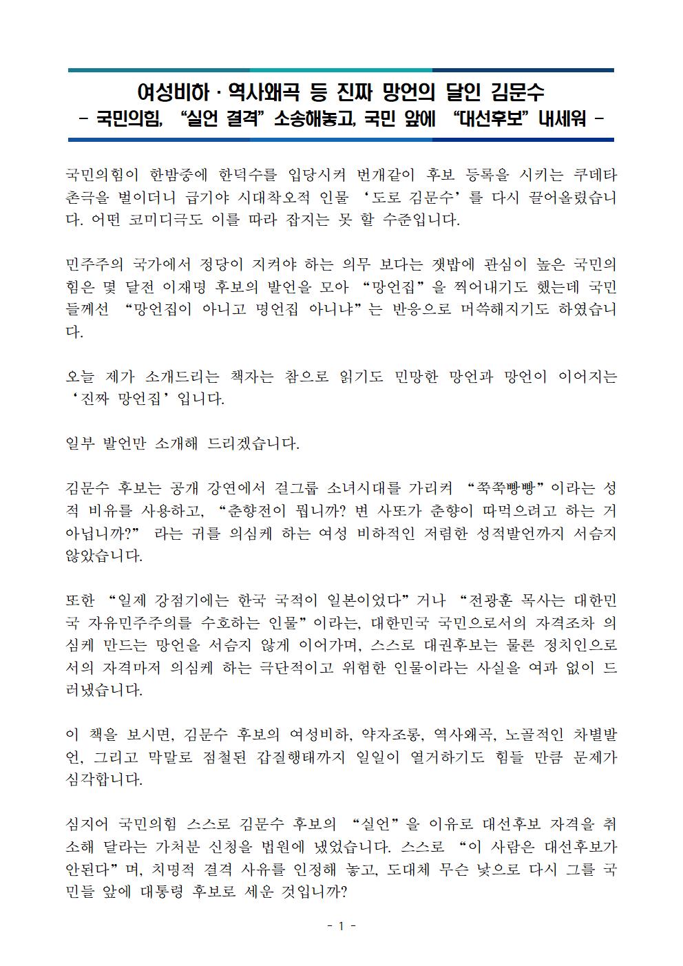 일, 2025/05/11- 00:00 에 admin 에 의해 제출됨 [0] 관련 개인/그룹 민주당 중앙당 정당 더불어민주당 지역 미특정 카테고리 보도자료 김문수진짜망언집_신속대응단.pdf250511_진짜 망언의 달인 김문수.pdf공유 공유하기 닫기페이스북트위터카카오톡URL 복사 링크 https://theminjoo.kr/main/sub/news/view.php?sno=0&brd=188&post=1211212&search= Like 0 Dislike 0 1 view 댓글 달기 이름 제목 Comment 저장 Preview