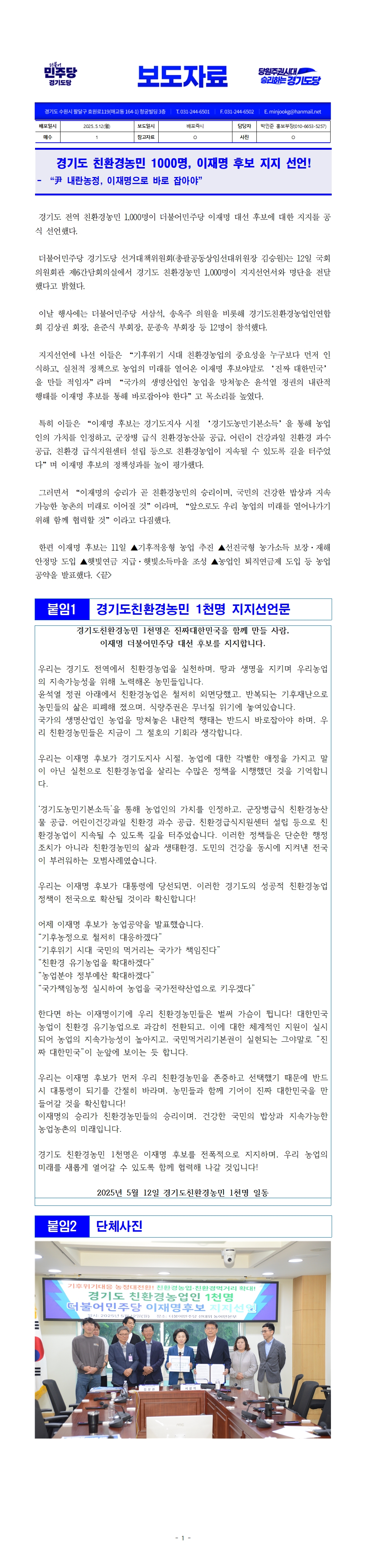 월, 2025/05/12- 00:00 에 admin 에 의해 제출됨 [0] 관련 개인/그룹 민주당 경기도당 정당 더불어민주당 지역 경기 카테고리 보도/논평 :250512_경기도_친환경농민_1000명,_이재명_후보_지지_선언!.hwp (2 Mbyte) 링크 https://www.minjookg.kr/sub01_news/press.php?board_page=1&board_mode=view&board_no=111502 Like 0 Dislike 0 댓글 달기 이름 제목 Comment 저장 Preview