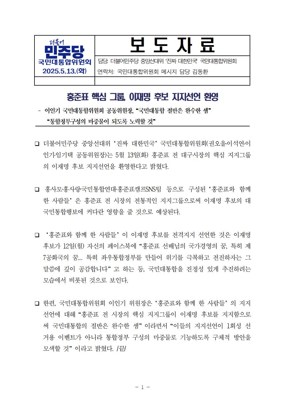화, 2025/05/13- 00:00 에 admin 에 의해 제출됨 [0] 관련 개인/그룹 민주당 중앙당 정당 더불어민주당 지역 미특정 카테고리 보도자료 250513_보도자료_국민대통합위원회_홍준표_핵심그룹_지지선언_환영_2.pdf공유 공유하기 닫기페이스북트위터카카오톡URL 복사 링크 https://theminjoo.kr/main/sub/news/view.php?sno=0&brd=188&post=1211264&search= Like 0 Dislike 0 댓글 달기 이름 제목 Comment 저장 Preview