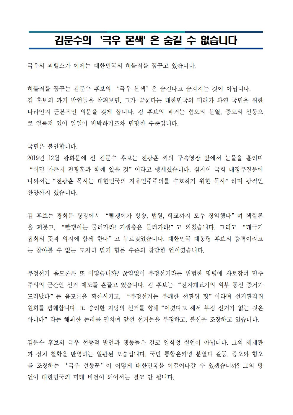 금, 2025/05/16- 00:00 에 admin 에 의해 제출됨 [0] 관련 개인/그룹 민주당 중앙당 정당 더불어민주당 지역 미특정 카테고리 보도자료 김문수 극우선동집.pdf250516_김문수의_극우_본색_은_숨길_수_없습니다.pdf공유 공유하기 닫기페이스북트위터카카오톡URL 복사 링크 https://theminjoo.kr/main/sub/news/view.php?sno=0&brd=188&post=1211394&search= Like 0 Dislike 0 댓글 달기 이름 제목 Comment 저장 Preview