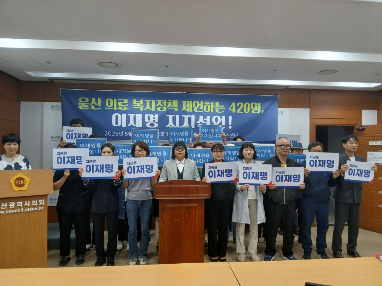 ○울산의 공공의료 시스템,의료,사회복지 정책의 개선을 촉구하는 시민420명은5월14일13시30분,울산시 의회 프레스센터에서20여명이 참석한 가운데 이재명 대통령 후보를 지지하는 기자회견을 했다.