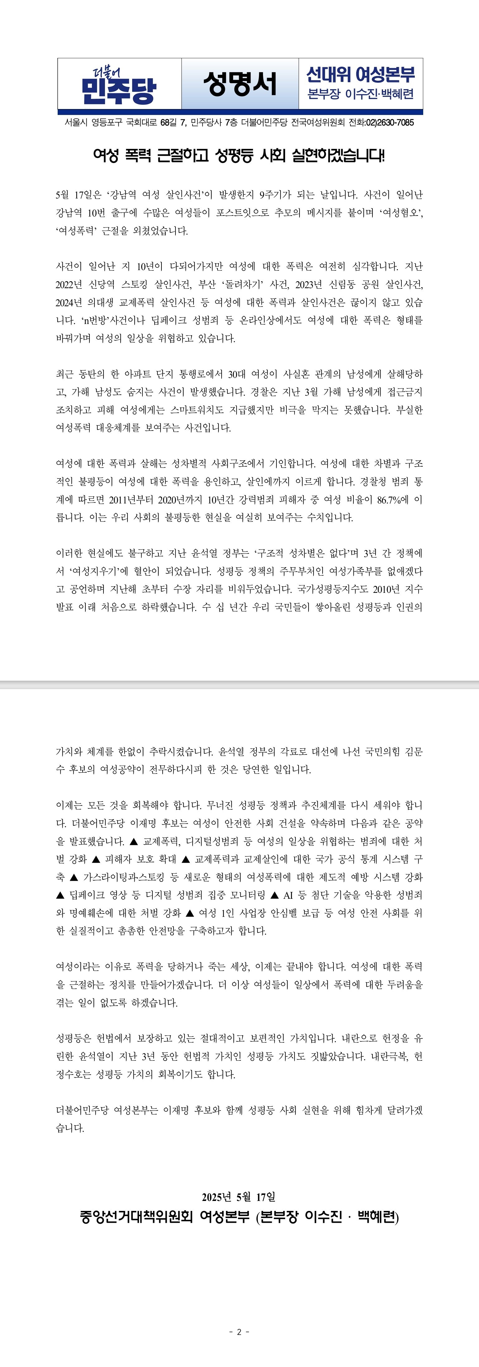 토, 2025/05/17- 00:00 에 admin 에 의해 제출됨 [0] 관련 개인/그룹 민주당 중앙당 정당 더불어민주당 지역 미특정 카테고리 보도자료 250517_여성본부_강남역살인사건_성명서.pdf공유 공유하기 닫기페이스북트위터카카오톡URL 복사 링크 https://theminjoo.kr/main/sub/news/view.php?sno=0&brd=188&post=1211443&search= Like 0 Dislike 0 댓글 달기 이름 제목 Comment 저장 Preview