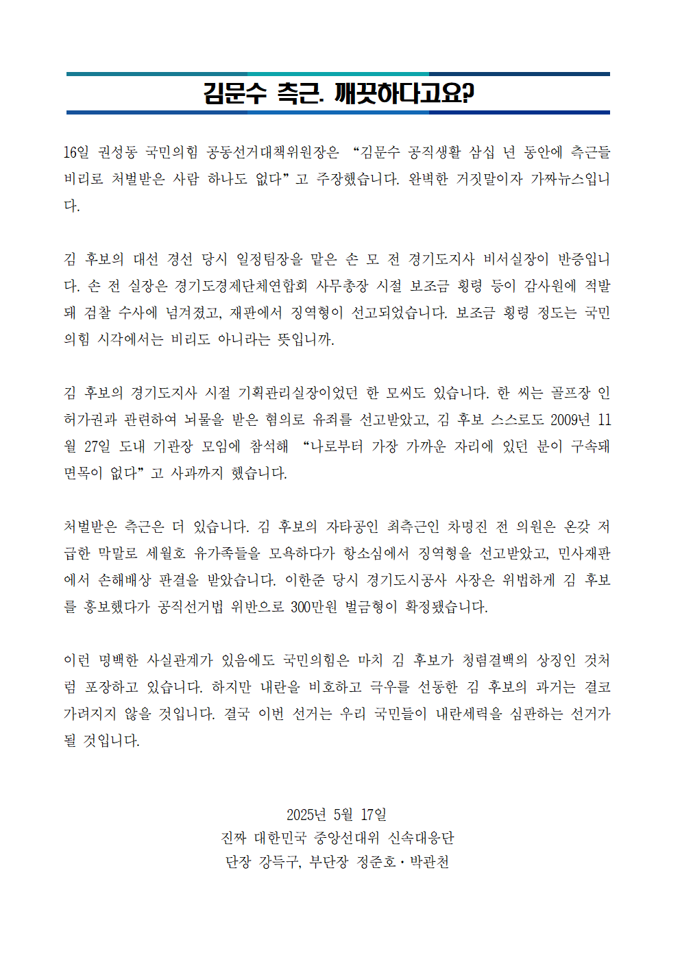 토, 2025/05/17- 00:00 에 admin 에 의해 제출됨 [0] 관련 개인/그룹 민주당 중앙당 정당 더불어민주당 지역 미특정 카테고리 보도자료 250517_김문수_측근_깨끗하다고요_.pdf공유 공유하기 닫기페이스북트위터카카오톡URL 복사 링크 https://theminjoo.kr/main/sub/news/view.php?sno=0&brd=188&post=1211464&search= Like 0 Dislike 0 댓글 달기 이름 제목 Comment 저장 Preview