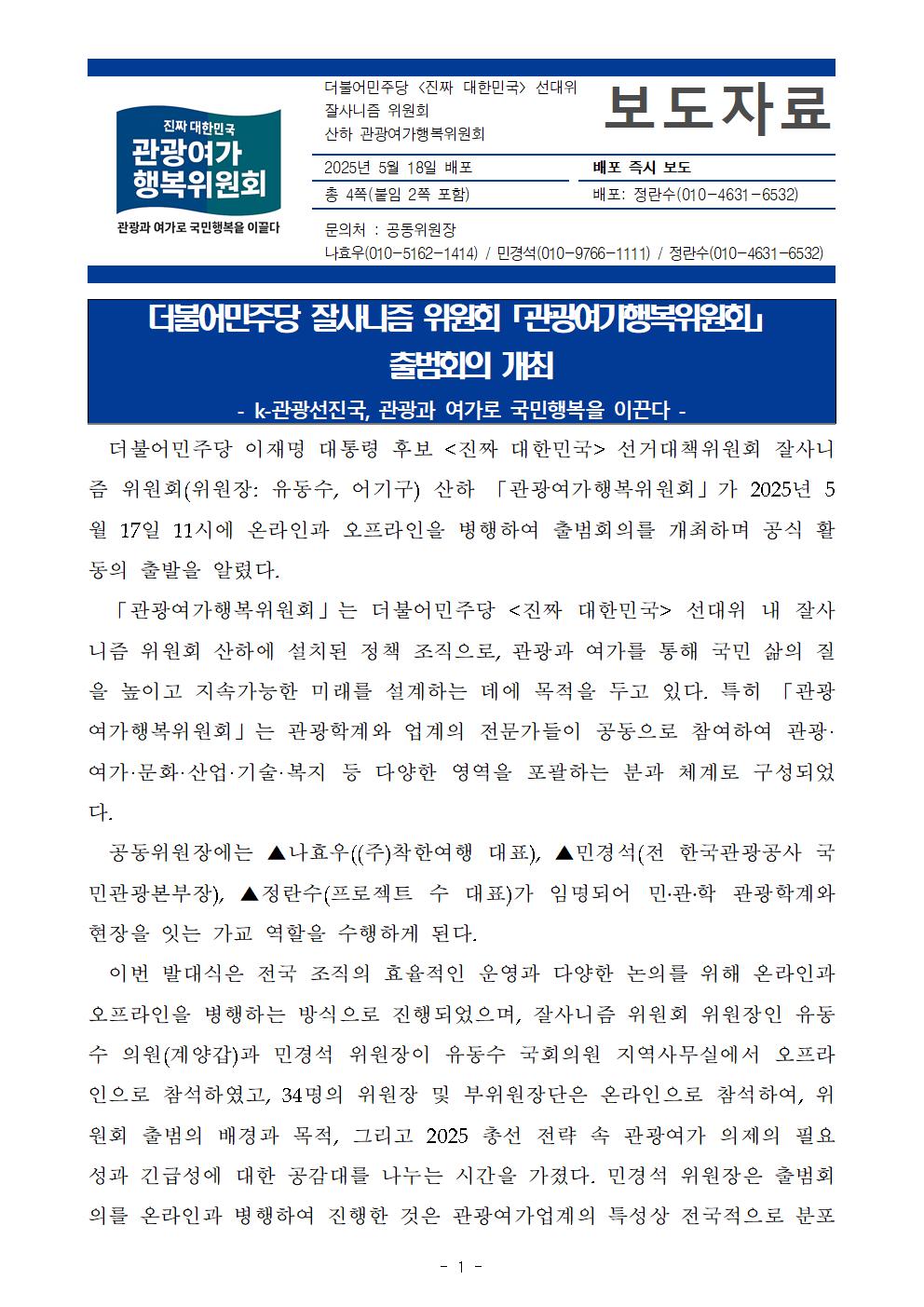 일, 2025/05/18- 00:00 에 admin 에 의해 제출됨 [0] 관련 개인/그룹 민주당 중앙당 정당 더불어민주당 지역 미특정 카테고리 보도자료 250518_잘사니즘위_관광여가행복위_보도자료_출범회의_개최.pdf공유 공유하기 닫기페이스북트위터카카오톡URL 복사 링크 https://theminjoo.kr/main/sub/news/view.php?sno=0&brd=188&post=1211486&search= Like 0 Dislike 0 12 views 댓글 달기 이름 제목 Comment 저장 Preview