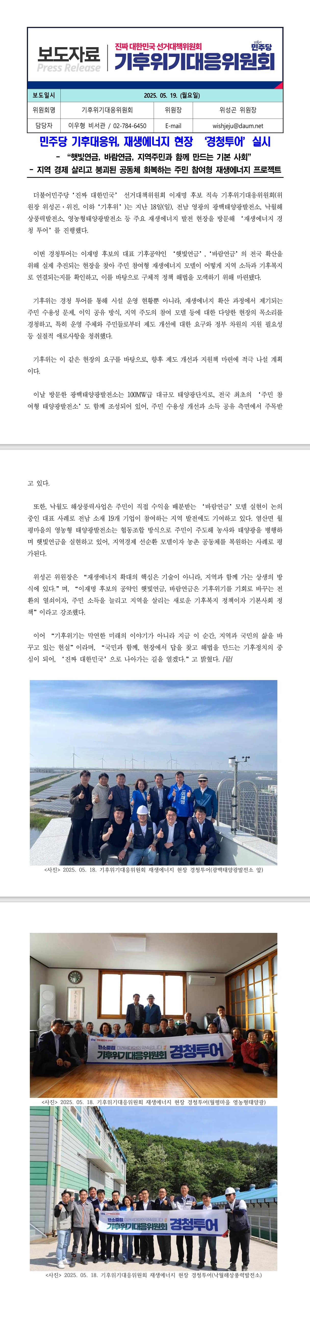 월, 2025/05/19- 00:00 에 admin 에 의해 제출됨 [0] 관련 개인/그룹 민주당 중앙당 정당 더불어민주당 지역 미특정 카테고리 보도자료 250519_기후위기대응위_보도자료_재생에너지_현장_경청투어_실시.pdf공유 공유하기 닫기페이스북트위터카카오톡URL 복사 링크 https://theminjoo.kr/main/sub/news/view.php?sno=0&brd=188&post=1211503&search= Like 0 Dislike 0 댓글 달기 이름 제목 Comment 저장 Preview