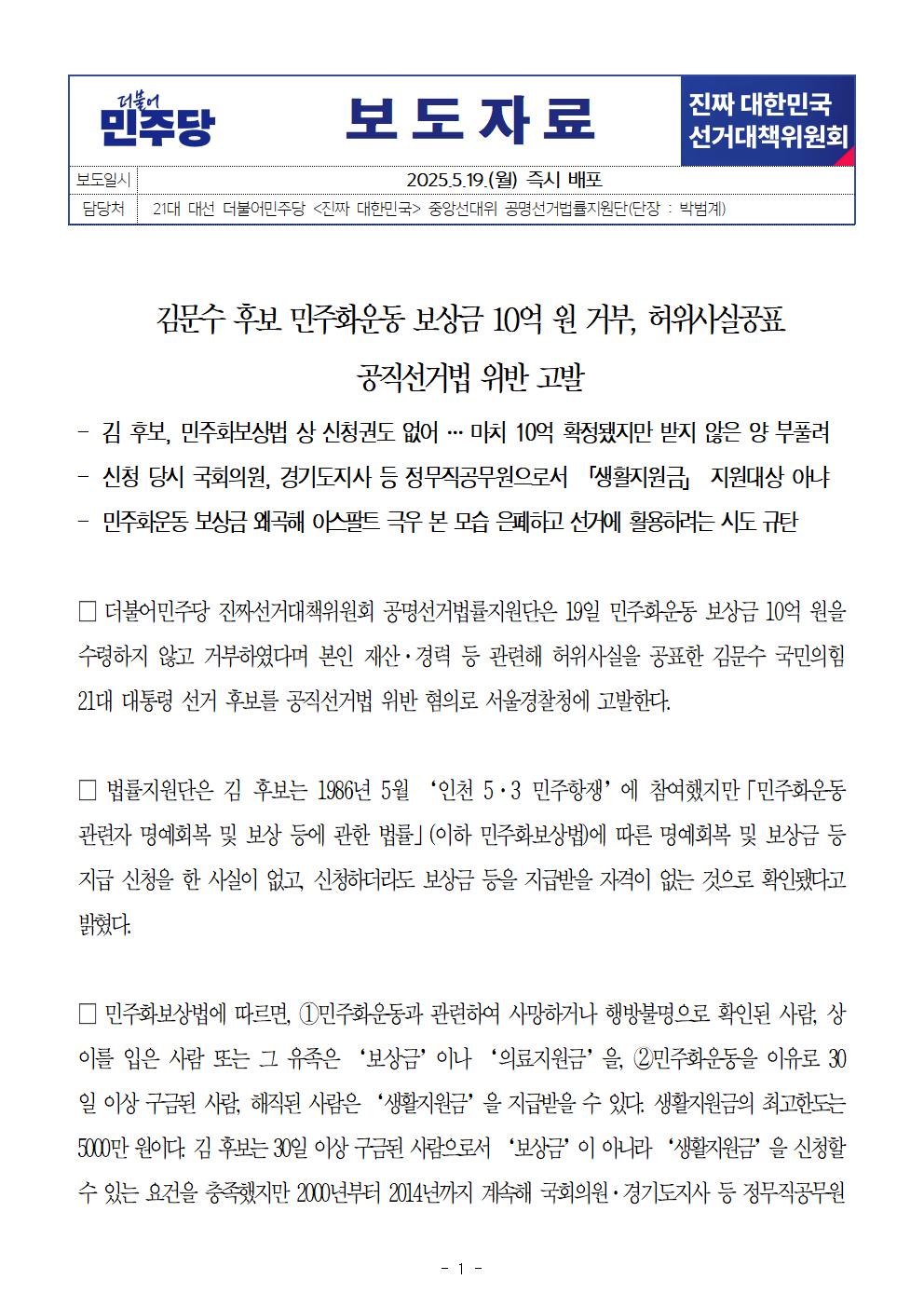 월, 2025/05/19- 00:00 에 admin 에 의해 제출됨 [0] 관련 개인/그룹 민주당 중앙당 정당 더불어민주당 지역 미특정 카테고리 보도자료 250519_[보도자료] 김문수_민주화보상금.pdf공유 공유하기 닫기페이스북트위터카카오톡URL 복사 링크 https://theminjoo.kr/main/sub/news/view.php?sno=0&brd=188&post=1211513&search= Like 0 Dislike 0 댓글 달기 이름 제목 Comment 저장 Preview
