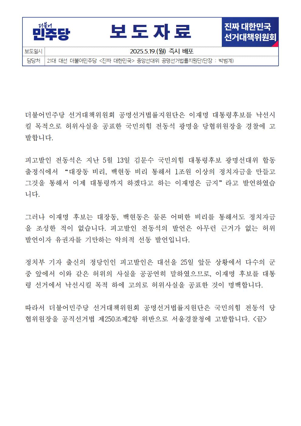 월, 2025/05/19- 00:00 에 admin 에 의해 제출됨 [0] 관련 개인/그룹 민주당 중앙당 정당 더불어민주당 지역 미특정 카테고리 보도자료 250519_보도자료_국민의힘_전동석_고발허위사실공표.pdf공유 공유하기 닫기페이스북트위터카카오톡URL 복사 링크 https://theminjoo.kr/main/sub/news/view.php?sno=0&brd=188&post=1211514&search= Like 0 Dislike 0 댓글 달기 이름 제목 Comment 저장 Preview