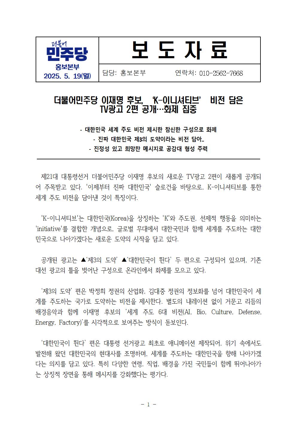 월, 2025/05/19- 00:00 에 admin 에 의해 제출됨 [0] 관련 개인/그룹 민주당 중앙당 정당 더불어민주당 지역 미특정 카테고리 보도자료 홍보본부_K-이니셔티브 TV광고.mp4제3의도약 뛴다_스틸컷모음.zip홍보본부_K-이니셔티브 TV광고_보도자료.pdf공유 공유하기 닫기페이스북트위터카카오톡URL 복사 링크 https://theminjoo.kr/main/sub/news/view.php?sno=0&brd=188&post=1211515&search= Like 0 Dislike 0 1 view 댓글 달기 이름 제목 Comment 저장 Preview