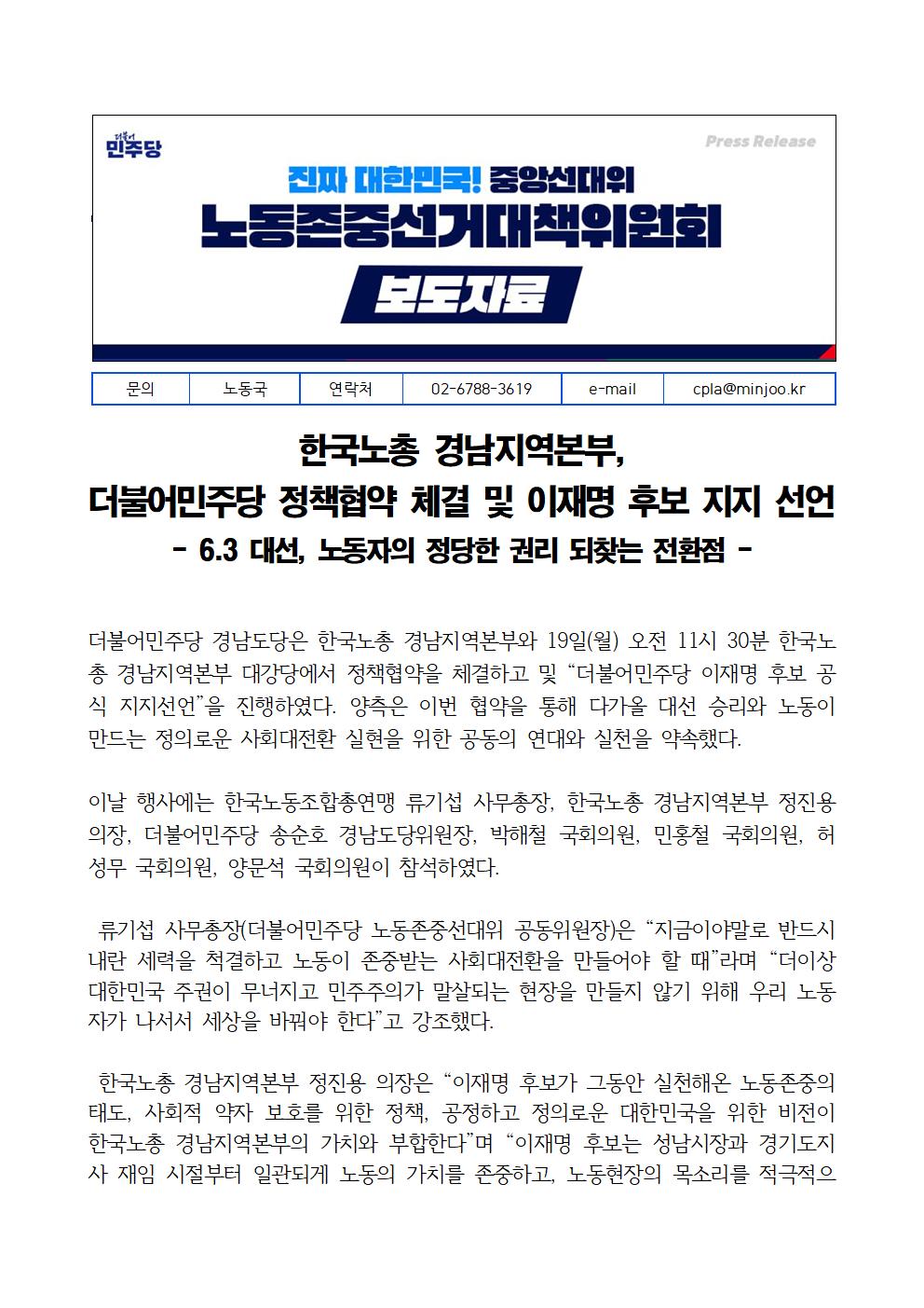 월, 2025/05/19- 00:00 에 admin 에 의해 제출됨 [0] 관련 개인/그룹 민주당 중앙당 정당 더불어민주당 지역 미특정 카테고리 보도자료 250519_노동존중선대위_보도자료_한국노총_경남지역본부_더불어민주당_정책협약_체결_및_지지_선언.pdf공유 공유하기 닫기페이스북트위터카카오톡URL 복사 링크 https://theminjoo.kr/main/sub/news/view.php?sno=0&brd=188&post=1211520&search= Like 0 Dislike 0 댓글 달기 이름 제목 Comment 저장 Preview
