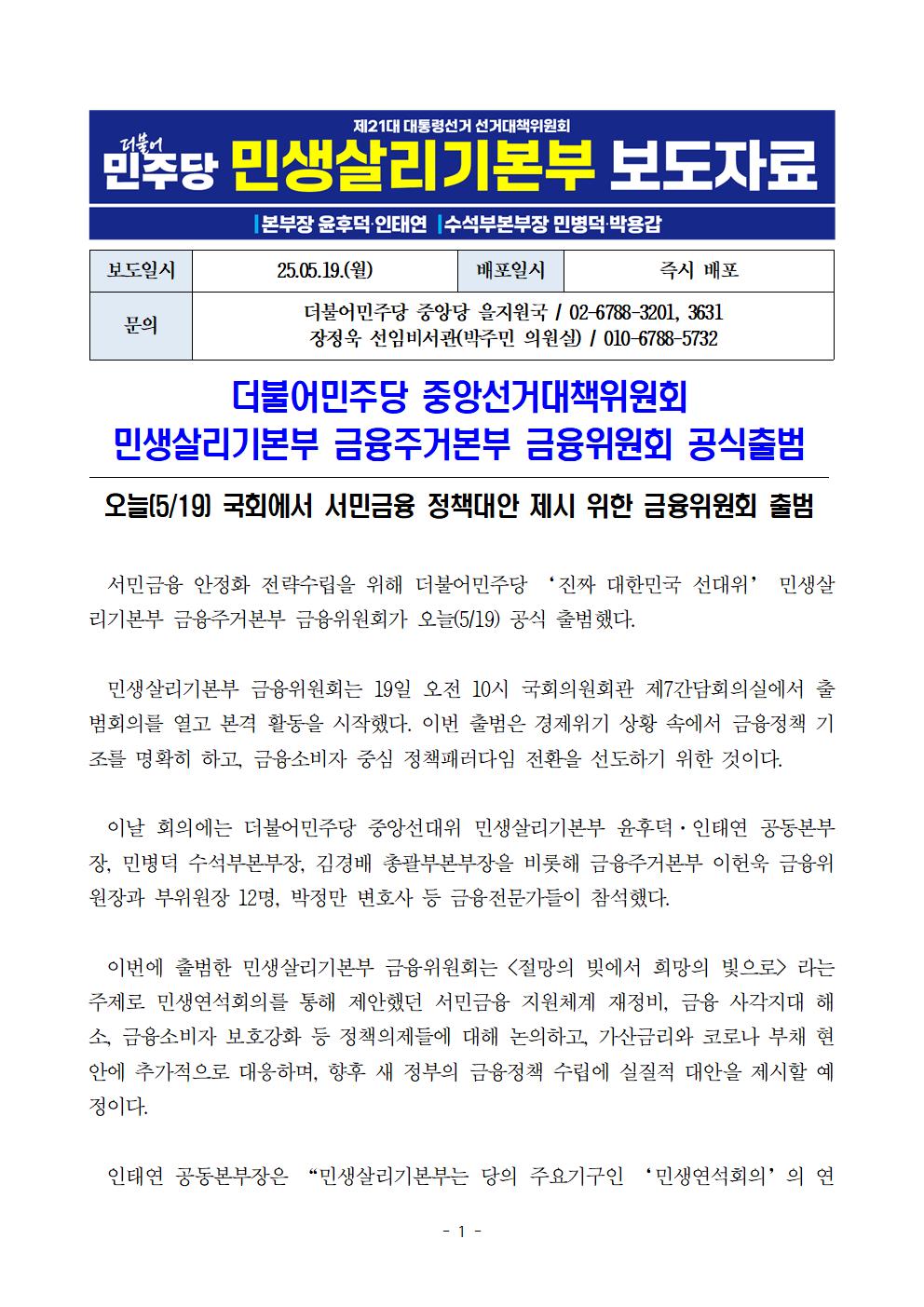 월, 2025/05/19- 00:00 에 admin 에 의해 제출됨 [0] 관련 개인/그룹 민주당 중앙당 정당 더불어민주당 지역 미특정 카테고리 보도자료 250519_민생살리기본부_금융주거본부_금융위원회_보도자료_출범회의.pdf공유 공유하기 닫기페이스북트위터카카오톡URL 복사 링크 https://theminjoo.kr/main/sub/news/view.php?sno=0&brd=188&post=1211521&search= Like 0 Dislike 0 3 views 댓글 달기 이름 제목 Comment 저장 Preview