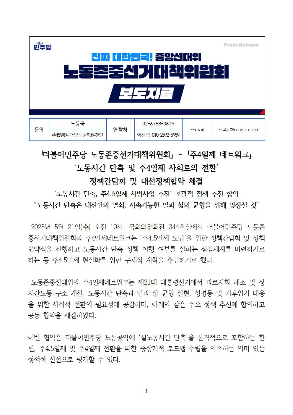 수, 2025/05/21- 00:00 에 admin 에 의해 제출됨 [0] 관련 개인/그룹 민주당 중앙당 정당 더불어민주당 지역 미특정 카테고리 보도자료 250521_보도자료_더불어민주당_진짜대한민국_노동존중선대위_주4_5일제_실천단_대선정책협약.pdf공유 공유하기 닫기페이스북트위터카카오톡URL 복사 링크 https://theminjoo.kr/main/sub/news/view.php?sno=0&brd=188&post=1211632&search= Like 0 Dislike 0 1 view 댓글 달기 이름 제목 Comment 저장 Preview