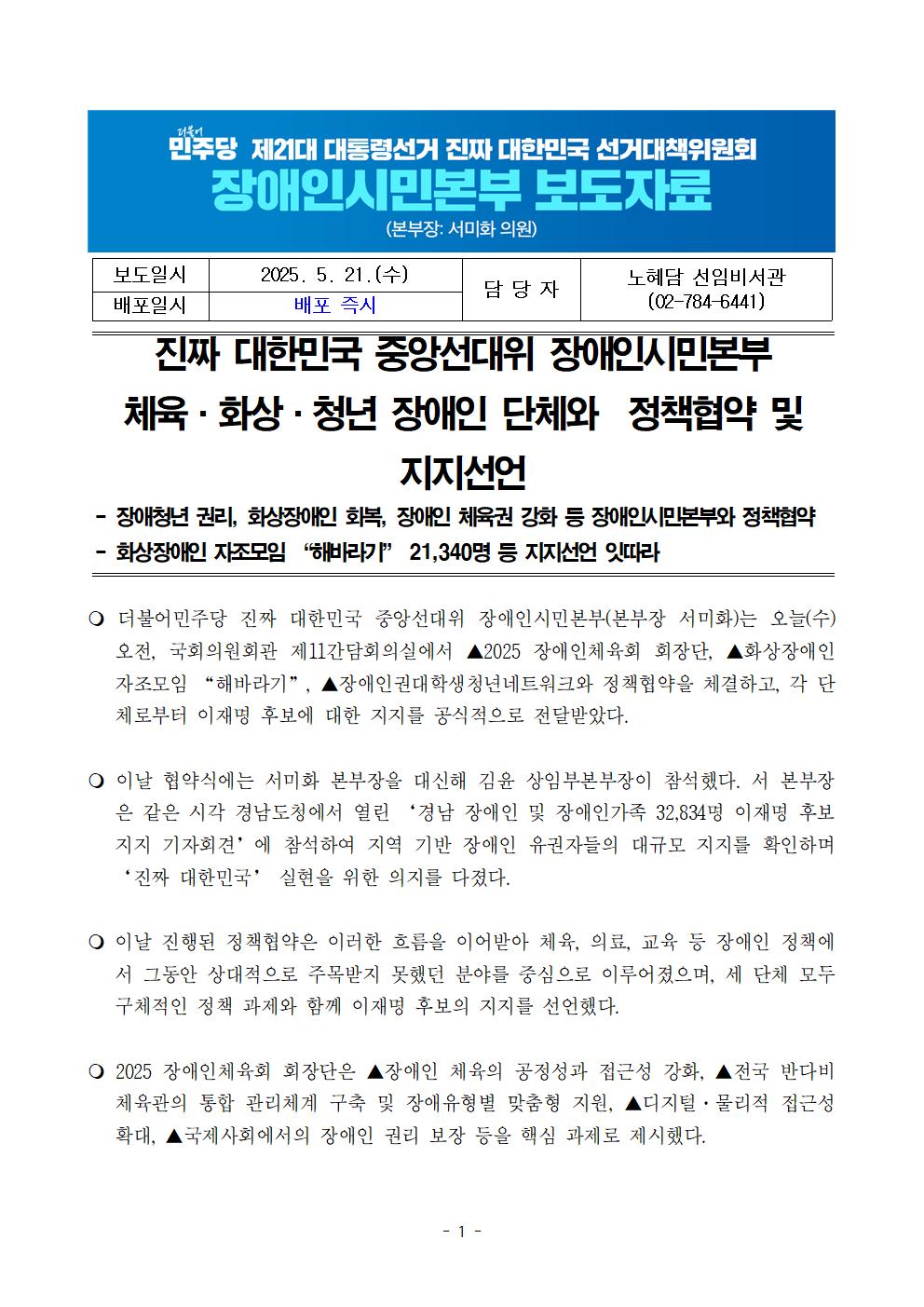 수, 2025/05/21- 00:00 에 admin 에 의해 제출됨 [0] 관련 개인/그룹 민주당 중앙당 정당 더불어민주당 지역 미특정 카테고리 보도자료 250521_장애인시민본부_체육_화상_청년_장애인_단체와_정책협약_및_지지선언.pdf공유 공유하기 닫기페이스북트위터카카오톡URL 복사 링크 https://theminjoo.kr/main/sub/news/view.php?sno=0&brd=188&post=1211623&search= Like 0 Dislike 0 댓글 달기 이름 제목 Comment 저장 Preview