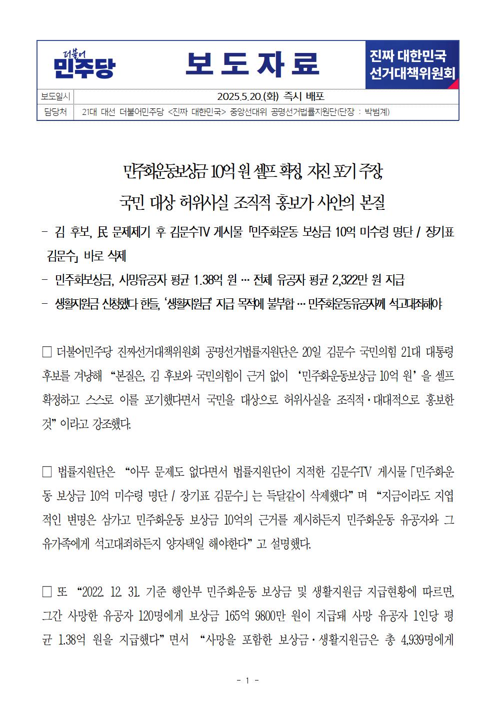 화, 2025/05/20- 00:00 에 admin 에 의해 제출됨 [0] 관련 개인/그룹 민주당 중앙당 정당 더불어민주당 지역 미특정 카테고리 보도자료 250520_보도자료_김문수_민주화보상금_반론_최종.pdf공유 공유하기 닫기페이스북트위터카카오톡URL 복사 링크 https://theminjoo.kr/main/sub/news/view.php?sno=0&brd=188&post=1211583&search= Like 0 Dislike 0 댓글 달기 이름 제목 Comment 저장 Preview