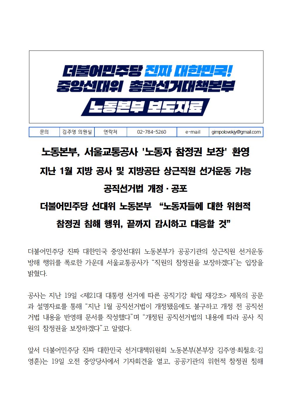 화, 2025/05/20- 00:00 에 admin 에 의해 제출됨 [0] 관련 개인/그룹 민주당 중앙당 정당 더불어민주당 지역 미특정 카테고리 보도자료 250520_노동본부_보도자료_서울교통공사_노동자_참정권_보장_환영.pdf공유 공유하기 닫기페이스북트위터카카오톡URL 복사 링크 https://theminjoo.kr/main/sub/news/view.php?sno=0&brd=188&post=1211562&search= Like 0 Dislike 0 댓글 달기 이름 제목 Comment 저장 Preview