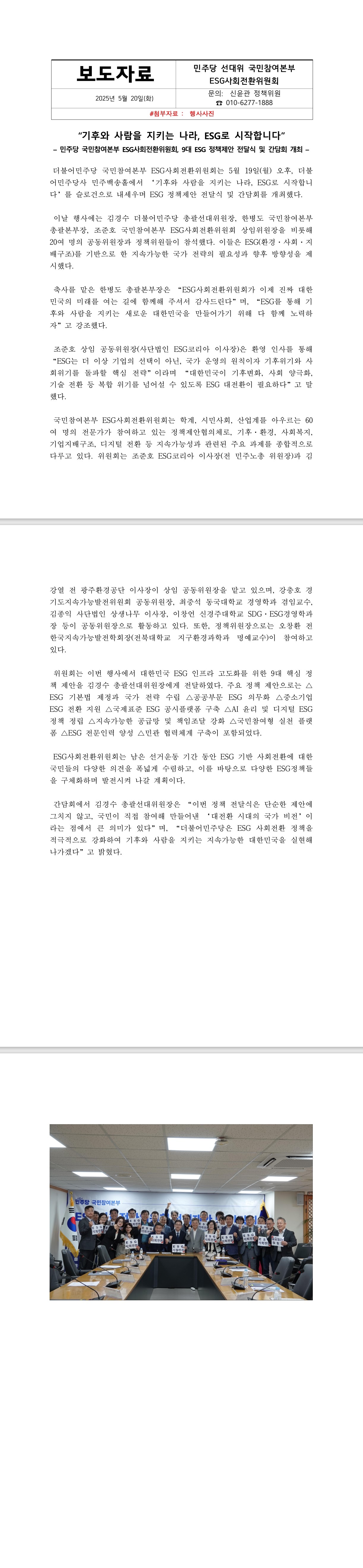 화, 2025/05/20- 00:00 에 admin 에 의해 제출됨 [0] 관련 개인/그룹 민주당 중앙당 정당 더불어민주당 지역 미특정 카테고리 보도자료 250520_국민참여본부ESG사회전환위_보도자료_ESG_정책제안_전달식_및_간담회.pdf공유 공유하기 닫기페이스북트위터카카오톡URL 복사 링크 https://theminjoo.kr/main/sub/news/view.php?sno=0&brd=188&post=1211573&search= Like 0 Dislike 0 1 view 댓글 달기 이름 제목 Comment 저장 Preview
