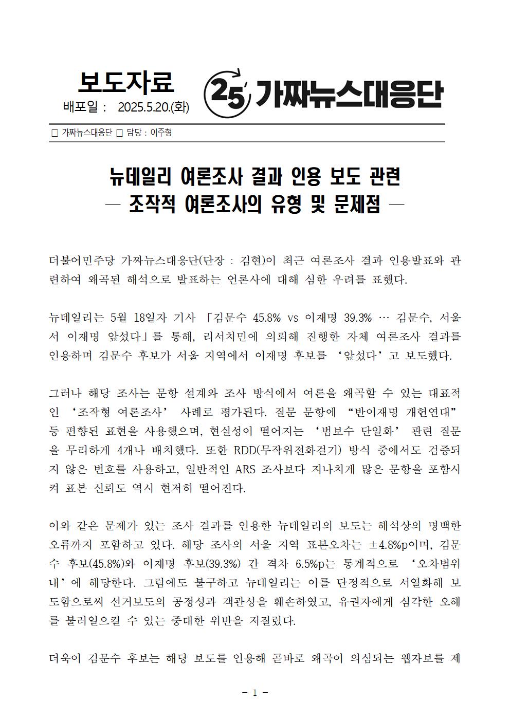 화, 2025/05/20- 00:00 에 admin 에 의해 제출됨 [0] 관련 개인/그룹 민주당 중앙당 정당 더불어민주당 지역 미특정 카테고리 보도자료 250520화_가짜뉴스대응단_뉴데일리_보도자료_수정.pdf공유 공유하기 닫기페이스북트위터카카오톡URL 복사 링크 https://theminjoo.kr/main/sub/news/view.php?sno=0&brd=188&post=1211552&search= Like 0 Dislike 0 1 view 댓글 달기 이름 제목 Comment 저장 Preview