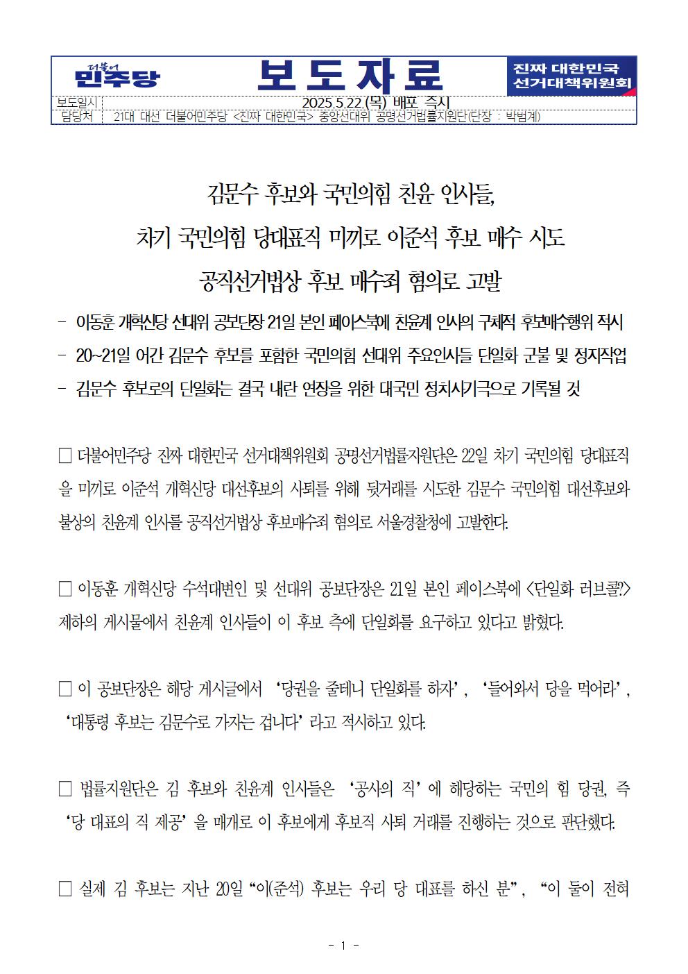 목, 2025/05/22- 00:00 에 admin 에 의해 제출됨 [0] 관련 개인/그룹 민주당 중앙당 정당 더불어민주당 지역 미특정 카테고리 보도자료 250522_[보도자료] 김문수_후보매수_최종F.pdf공유 공유하기 닫기페이스북트위터카카오톡URL 복사 링크 https://theminjoo.kr/main/sub/news/view.php?sno=0&brd=188&post=1211675&search= Like 0 Dislike 0 댓글 달기 이름 제목 Comment 저장 Preview