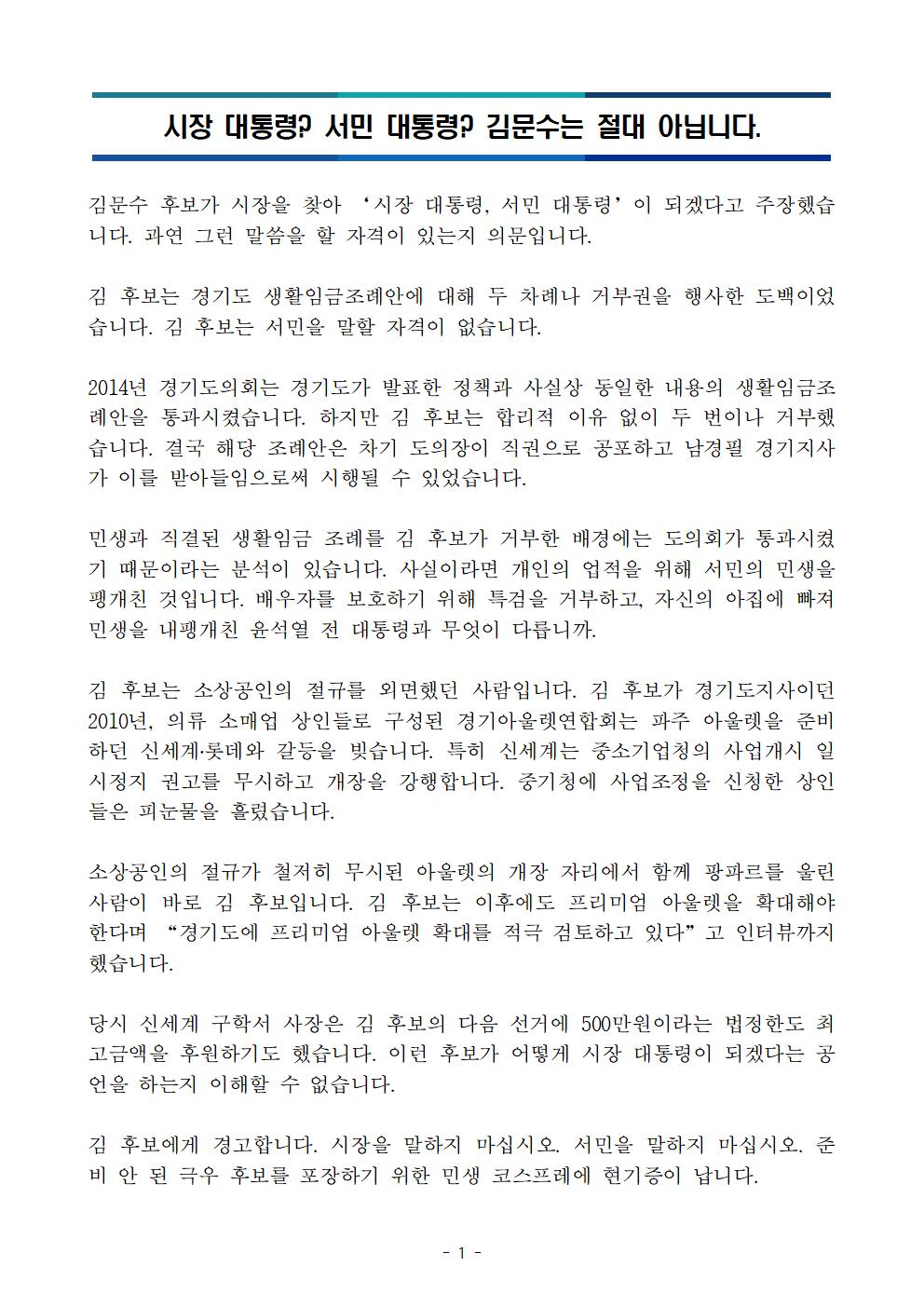 목, 2025/05/22- 00:00 에 admin 에 의해 제출됨 [0] 관련 개인/그룹 민주당 중앙당 정당 더불어민주당 지역 미특정 카테고리 보도자료 250522_시장 대통령 서민 대통령 김문수는 절대 아닙니다..pdf공유 공유하기 닫기페이스북트위터카카오톡URL 복사 링크 https://theminjoo.kr/main/sub/news/view.php?sno=0&brd=188&post=1211677&search= Like 0 Dislike 0 댓글 달기 이름 제목 Comment 저장 Preview