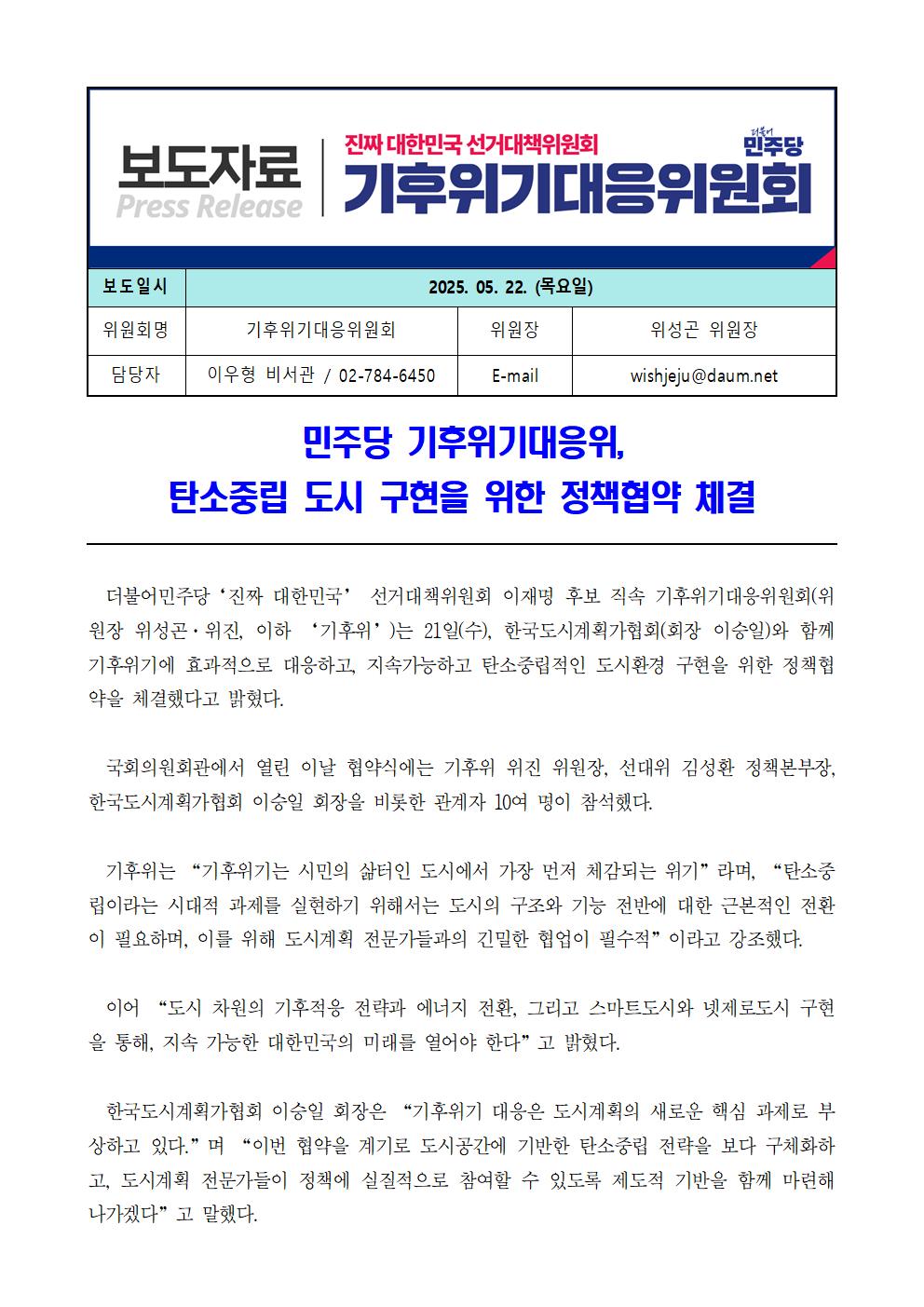 목, 2025/05/22- 00:00 에 admin 에 의해 제출됨 [0] 관련 개인/그룹 민주당 중앙당 정당 더불어민주당 지역 미특정 카테고리 보도자료 250522_기후위기대응위_보도자료_탄소중립_도시_구현_정책협약.pdf공유 공유하기 닫기페이스북트위터카카오톡URL 복사 링크 https://theminjoo.kr/main/sub/news/view.php?sno=0&brd=188&post=1211691&search= Like 0 Dislike 0 댓글 달기 이름 제목 Comment 저장 Preview