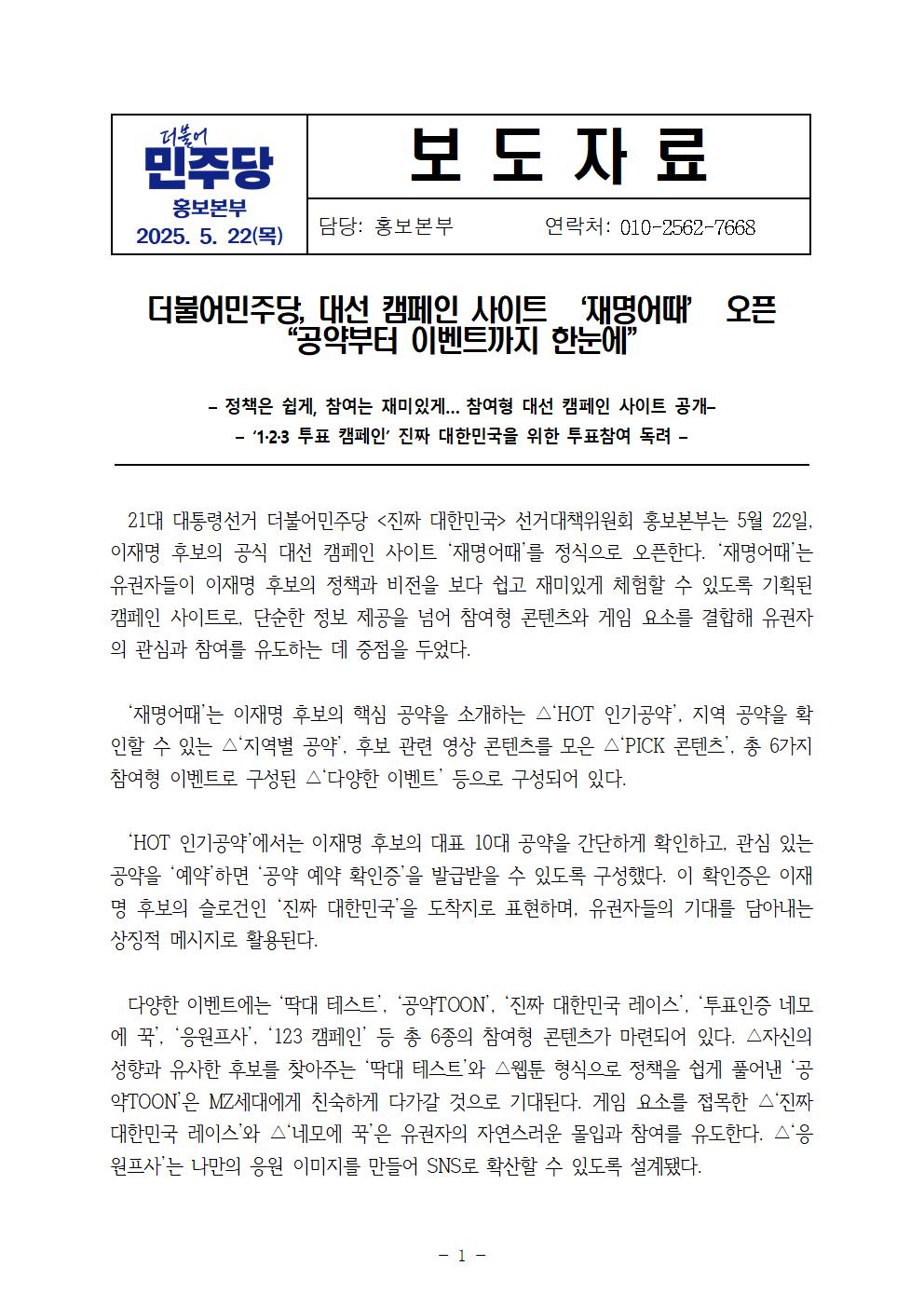 목, 2025/05/22- 00:00 에 admin 에 의해 제출됨 [0] 관련 개인/그룹 민주당 중앙당 정당 더불어민주당 지역 미특정 카테고리 보도자료 홍보본부_대선_캠페인_사이트_재명어때_공개_보도자료_F.pdf공유 공유하기 닫기페이스북트위터카카오톡URL 복사 링크 https://theminjoo.kr/main/sub/news/view.php?sno=0&brd=188&post=1211696&search= Like 0 Dislike 0 댓글 달기 이름 제목 Comment 저장 Preview