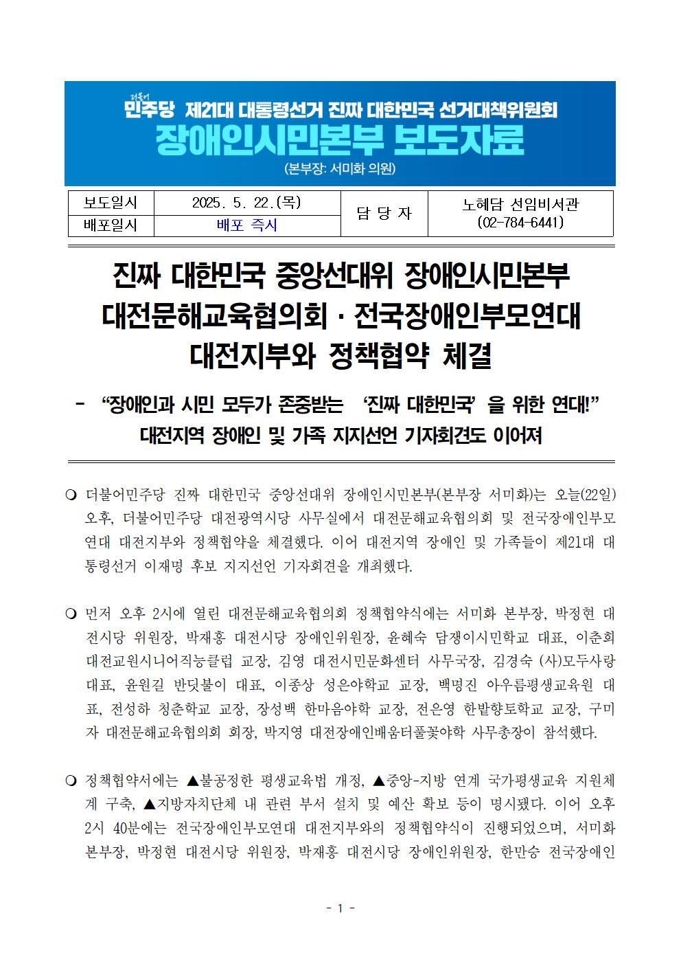 목, 2025/05/22- 00:00 에 admin 에 의해 제출됨 [0] 관련 개인/그룹 민주당 중앙당 정당 더불어민주당 지역 미특정 카테고리 보도자료 250522_장애인시민본부_보도자료_대전문해교육협의회·전국장애인부모연대_대전지부_정책협약식_등.pdf공유 공유하기 닫기페이스북트위터카카오톡URL 복사 링크 https://theminjoo.kr/main/sub/news/view.php?sno=0&brd=188&post=1211700&search= Like 0 Dislike 0 댓글 달기 이름 제목 Comment 저장 Preview