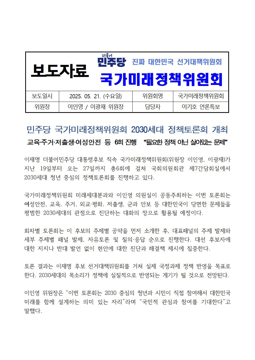 목, 2025/05/22- 00:00 에 admin 에 의해 제출됨 [0] 관련 개인/그룹 민주당 중앙당 정당 더불어민주당 지역 미특정 카테고리 보도자료 250522_국가미래정책위_보도자료_2030세대_정책토론회.pdf공유 공유하기 닫기페이스북트위터카카오톡URL 복사 링크 https://theminjoo.kr/main/sub/news/view.php?sno=0&brd=188&post=1211708&search= Like 0 Dislike 0 댓글 달기 이름 제목 Comment 저장 Preview