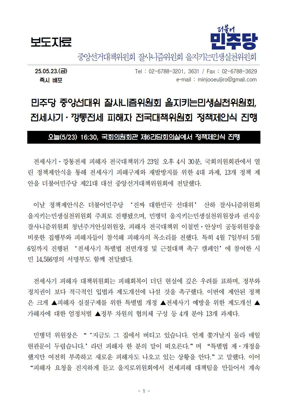 금, 2025/05/23- 00:00 에 admin 에 의해 제출됨 [0] 관련 개인/그룹 민주당 중앙당 정당 더불어민주당 지역 미특정 카테고리 보도자료 250523_을지키는민생실천위_보도자료_전세사기·깡통전세_피해자_전국대책위원회_정책제안식.pdf공유 공유하기 닫기페이스북트위터카카오톡URL 복사 링크 https://theminjoo.kr/main/sub/news/view.php?sno=0&brd=188&post=1211772&search= Like 0 Dislike 0 댓글 달기 이름 제목 Comment 저장 Preview