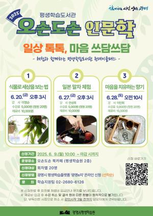 광명시(시장 박승원) 평생학습원은 오는 9일부터 원데이 인문학 프로그램 ‘2025 오손도손 인문학’ 참여자를 선착순 모집한다.‘오손도손 인문학’은 평생학습도서관과 연계해 오손도손 북카페를 학습문화 공간으로 운영하며, 시민의 평생학습 접근성을 높이기 위해 지난해 시작한 신규사업이다.이번 프로그램은 ‘2025년 상반기 광명지식상점’에서 인기를 끌었던 일부 강좌를 원데이 클래스 형식으로 재구성한 것으로, 시민들의 일상 속 수요를 반영해 ▲식물로 세상을 보는 법 ▲일본 말차 체험 ▲마음을 치유하는 향기 등 총 3개 강좌로 구성했다.대화와