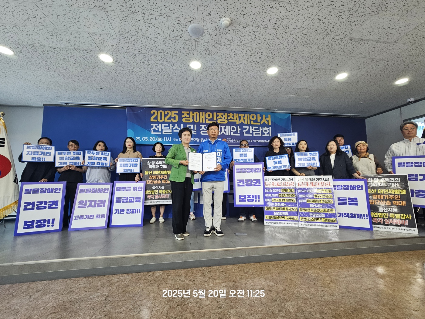 20일 오전에는 울산장애인부모연대 울산지부와 태연재활원 상습학대사건 공동대책위원회와 함께 정책제안 전달식을 가졌다. 이들 단체들은 ▲돌봄 국가책임제 시행 ▲복지 실현을 위한 자립지원 기반 확충 ▲일자리 참여 확대를 위한 고용 기반 조성 ▲보건의료 서비스 접근성 개선과 건강권 보장 등을 제안했다.