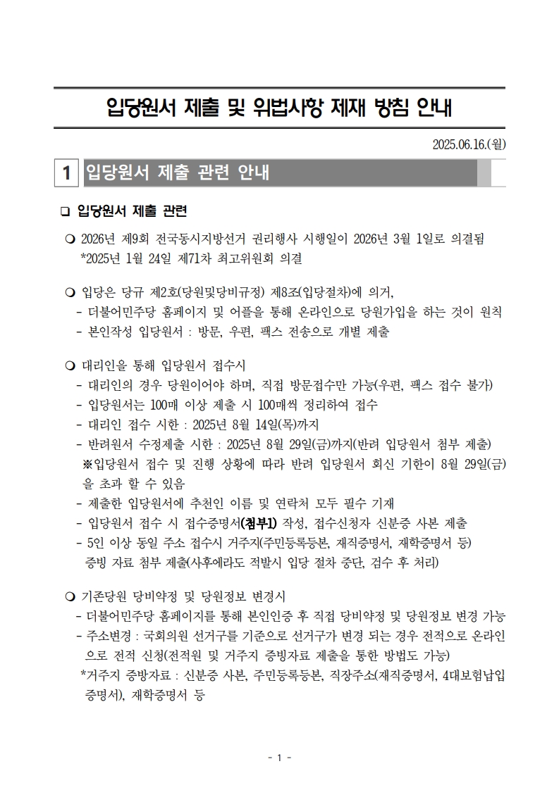 화, 2025/06/17- 00:00 에 admin 에 의해 제출됨 [0] 관련 개인/그룹 민주당 전북도당 정당 더불어민주당 지역 전북 카테고리 공지사항 250616_입당원서_제출_및_위법사항_제재_방침_안내대리인용_v2.pdf 링크 https://jeonbuk.theminjoo.kr/party/sub/news/view.php?brd=112&post=1857&board_id=notice Like 0 Dislike 0 댓글 달기 이름 제목 Comment 저장 Preview