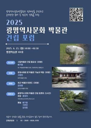 광명시(박승원 시장)가 광명역사문화박물관 건립을 위해 전문가와 시민이 함께 논의하는 공론의 장을 마련한다.시는 오는 23일 평생학습원에서 광명역사문화박물관 건립을 위한 첫 번째 포럼을 개최한다.광명역사문화박물관은 광명시 고유의 역사·문화를 한데 모아 보존·전시하는 시설로, 2032년 개관을 목표로 ‘광명역사문화박물관 건립 타당성 조사 및 기본계획 수립 용역’이 진행 중이다. 건립되면 광명시 최초의 공립 역사박물관이 될 예정이다.이번 포럼에서는 박물관의 필요성과 최근 트렌드, 지역 박물관의 기능과 역할에 대해 논의한다.포럼은 국립중앙