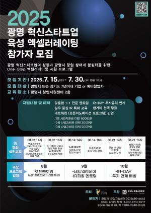 광명시(시장 박승원)가 지역 혁신 스타트업의 성장을 지원하고 창업 생태계 활성화를 위한 ‘혁신 스타트업 육성 액셀러레이팅 지원사업’을 본격 추진한다고 18일 밝혔다.이번 사업은 지역 경제의 새로운 성장동력을 확보하고 청년 일자리 창출을 뒷받침하기 위해 마련했다.선발된 스타트업에는 ▲업계 전문가의 1:1 맞춤형 멘토링 ▲실전 중심의 사업화 역량 강화 프로그램 ▲투자자 연계 및 피칭 기회 제공 ▲네트워킹 행사 등 다양한 성장 지원 프로그램이 제공된다.특히 기업설명회(IR) 투자유치 지원으로 실질적인 투자 연계에 집중하고, 투자 피칭 역