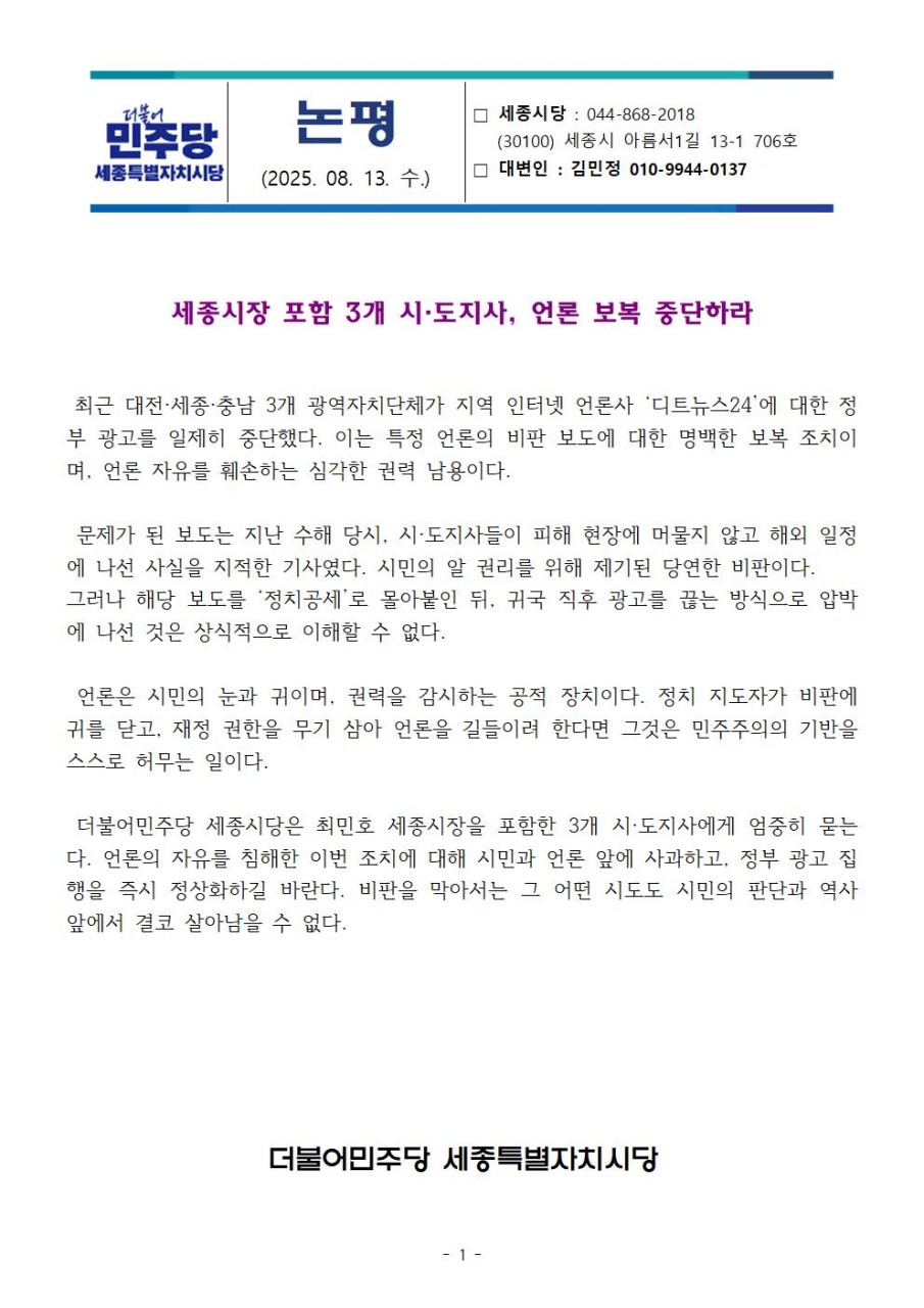 수, 2025/08/13- 00:00 에 admin 에 의해 제출됨 [0] 관련 개인/그룹 민주당 세종시당 정당 더불어민주당 지역 세종 카테고리 논평브리핑 링크 https://sejong.theminjoo.kr/party/sub/news/view.php?brd=54&post=979&board_id=briefing Like 0 Dislike 0 댓글 달기 이름 제목 Comment 저장 Preview