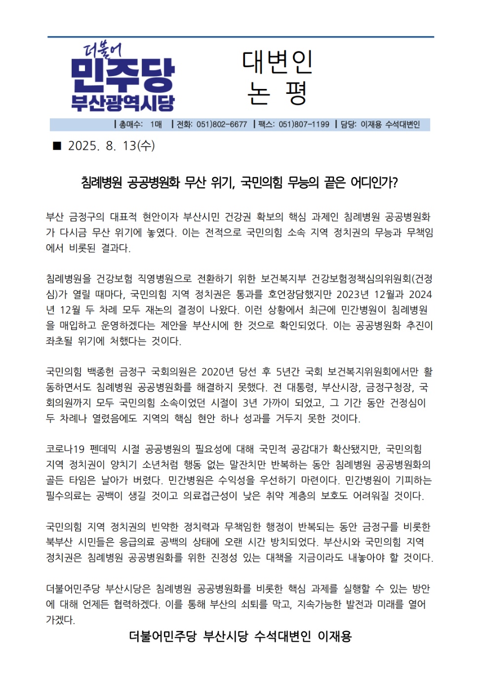 수, 2025/08/13- 00:00 에 admin 에 의해 제출됨 [0] 관련 개인/그룹 민주당 부산시당 정당 더불어민주당 지역 부산 카테고리 논평브리핑 링크 https://busan.theminjoo.kr/party/sub/news/view.php?brd=65&post=3722&board_id=briefing Like 0 Dislike 0 댓글 달기 이름 제목 Comment 저장 Preview