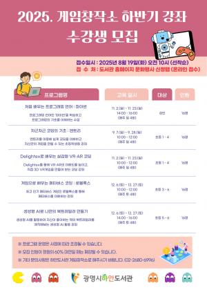 하안도서관은 시민 독서문화 확산과 평생학습 활성화를 위해 2025년 하반기 시민강좌 수강생 220명을 모집한다.강좌는 오는 9월 1일부터 12월 27일까지 하안도서관에서 진행된다.시민강좌로는 ▲성인 대상 ‘왕초보를 위한 여행 영어 회화’, ‘마음힐링 플러스펜 수채화’ ▲유아·어린이 대상 ‘와글와글 책놀이터’, ‘생각 쑥쑥 책씨앗’ 등 총 12개 프로그램을 운영한다.게임창작소에서는 ▲성인 대상 ‘처음 배우는 프로그래밍 언어: 파이썬’, ▲어린이 대상 ‘생성형 AI로 나만의 북 트레일러 만들기’ 등 5개 강좌를 마련했다.수강 신청은 광