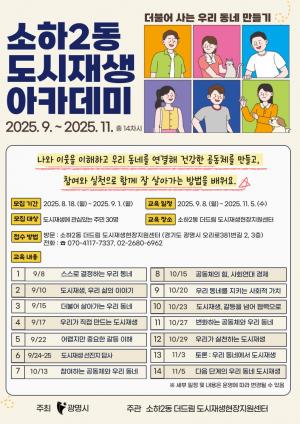 광명시(시장 박승원)는 18일부터 오는 9월 1일까지 ‘소하2동 도시재생 아카데미 2기’ 참여 시민을 모집한다.이번 아카데미는 오는 9월 8일 소하2동 더드림 도시재생현장지원센터에서 개강한다. ‘더불어 사는 우리 마을 만들기’를 주제로 도시재생에 관심있는 지역 주민과 도시재생 주민협의체를 대상으로 운영한다.이번 과정은 주민 참여와 실천으로 일상의 민주주의를 실현하고, 공동체와 연대해 우리 동네를 변화시킬 역량을 기르는 것을 목표로 한다.교육은 총 14차로 구성했다. ▲ 1강 스스로 결정하는 우리 동네 ▲ 2강 도시재생, 우리 삶의