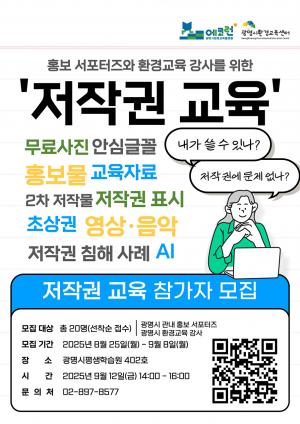 광명시 환경교육센터는 오는 9월 12일 광명시 평생학습원 402호에서 ‘저작권 교육’을 실시한다.이번 교육은 관내 홍보 서포터즈와 환경교육 강사를 대상으로 진행하며, 선착순 20명을 모집한다.교육의 목적은 환경교육 현장에서 자주 활용되는 홍보물과 교육자료 제작·활용 과정에서 발생할 수 있는 저작권 문제를 예방하고, 올바른 활용 방법을 안내하는 데 있다.최근 SNS(누리소통망) 홍보와 디지털 콘텐츠 제작이 늘어나면서 저작권 인식 부족으로 인한 침해 사례도 증가하고 있다. 이에 따라 센터는 참가자들이 저작권의 기본 개념부터 실제 활용법