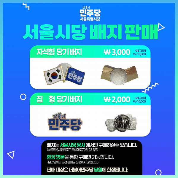 구매는 현장 결제(현금) 만 가능하며 구매 금액을 미리 지참해 주시면 원활하게 안내드리겠습니다. 더불어민주당 서울특별시당 찾아오시는 길 https://naver.me/FmfauSuC수령 가능 시간: 평일 09:00 ~ 18:00