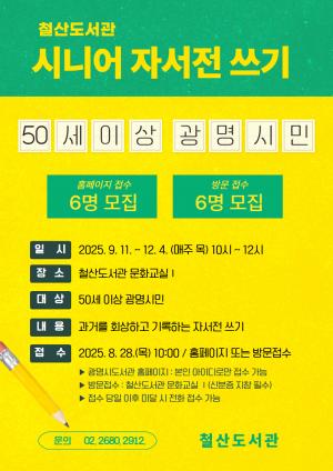 광명시(시장 박승원)는 오는 28일부터 시니어 세대의 활력 증진과 사회 참여를 돕기 위해 ‘자서전 쓰기 강좌’ 참가자를 모집한다.철산도서관은 2022년부터 시니어 세대가 독서와 글쓰기로 소통하고 공감하며 사회활동에 참여할 수 있도록 서평 쓰기, 수필 쓰기, 그림책 독서치료 등 다양한 프로그램을 운영해 왔다. 지난 3년간 약 130명의 시민이 참여하는 등 큰 호응을 얻었다.올해 하반기에는 시니어들이 자신의 삶을 돌아보고 기록으로 정리할 수 있도록 ‘자서전 쓰기 강좌’를 마련했다. 강좌는 9월 11일부터 12월 4일까지 매주 목요일,