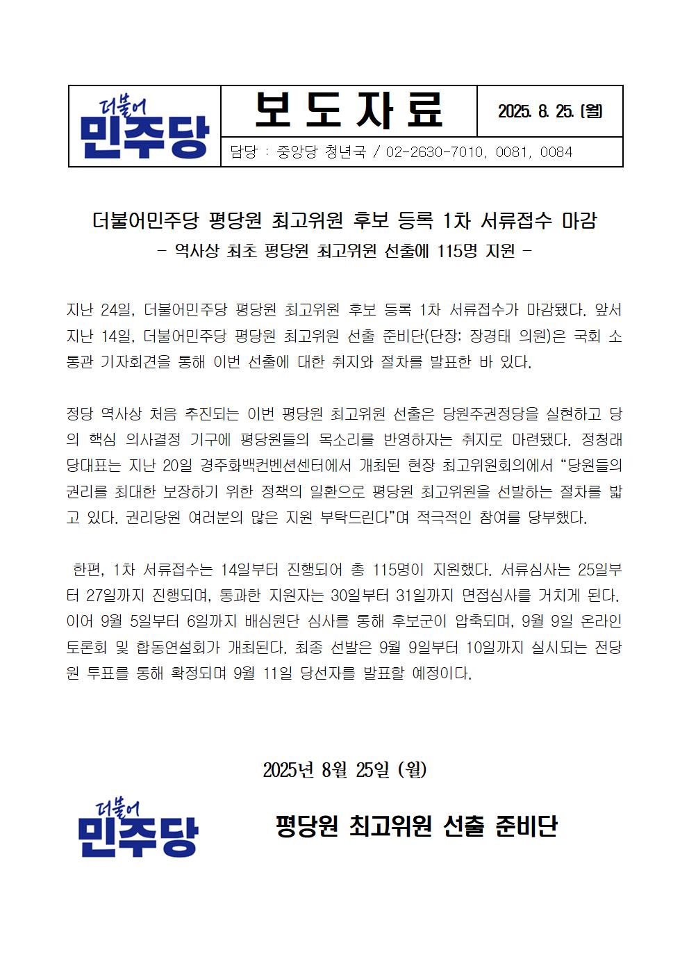 월, 2025/08/25- 00:00 에 admin 에 의해 제출됨 [0] 관련 개인/그룹 민주당 중앙당 정당 더불어민주당 지역 미특정 카테고리 보도자료 250825_보도자료_더불어민주당 평당원 최고위원 후보 등록 1차 서류접수 마감.pdf공유 공유하기 닫기페이스북트위터카카오톡URL 복사 링크 https://theminjoo.kr/main/sub/news/view.php?sno=0&brd=188&post=1213247&search= Like 0 Dislike 0 댓글 달기 이름 제목 Comment 저장 Preview