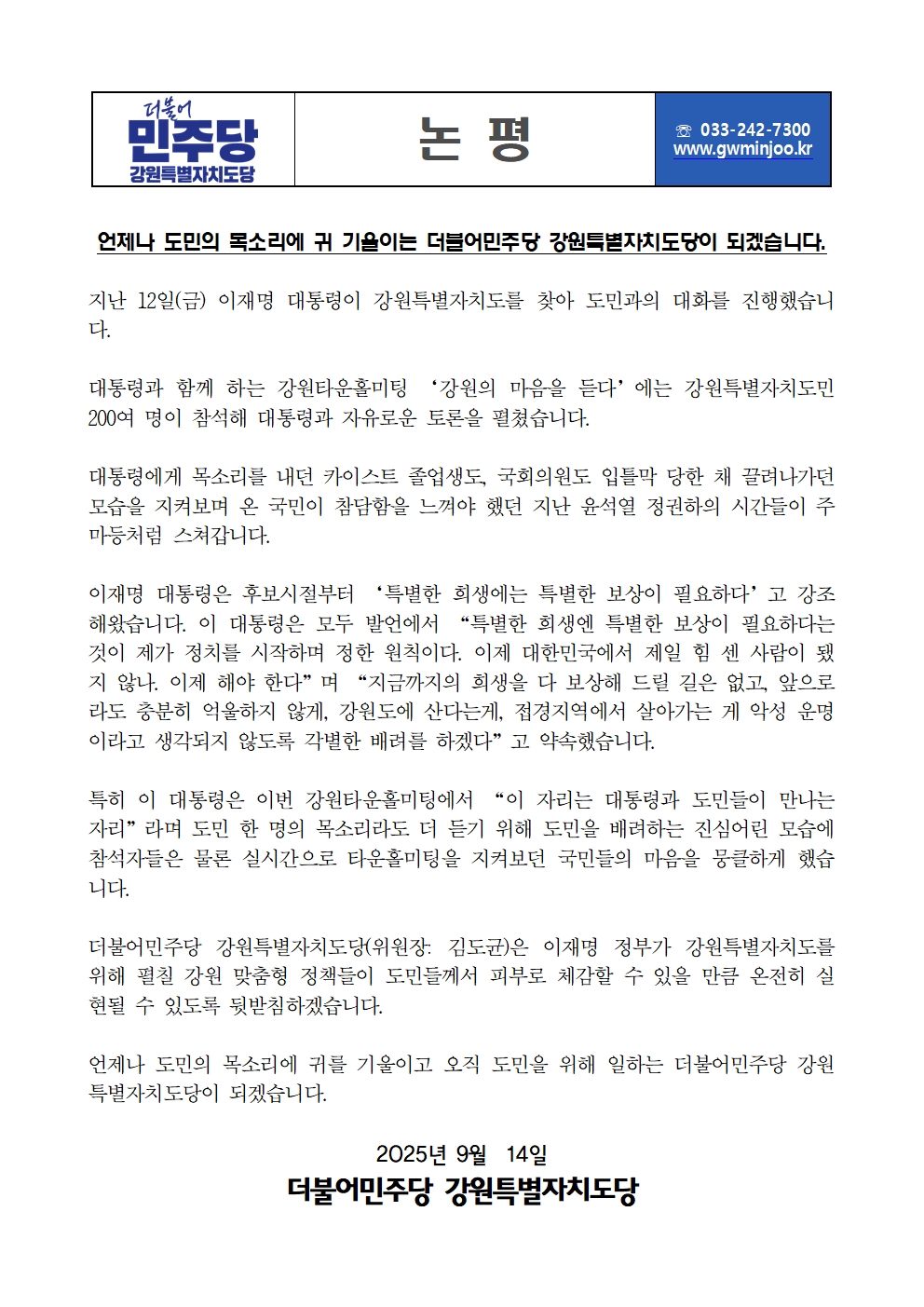 민주당 강원도당 언제나 도민의 목소리에 귀 기울이는 더불어민주당 강원특별자치도당이 ...새글