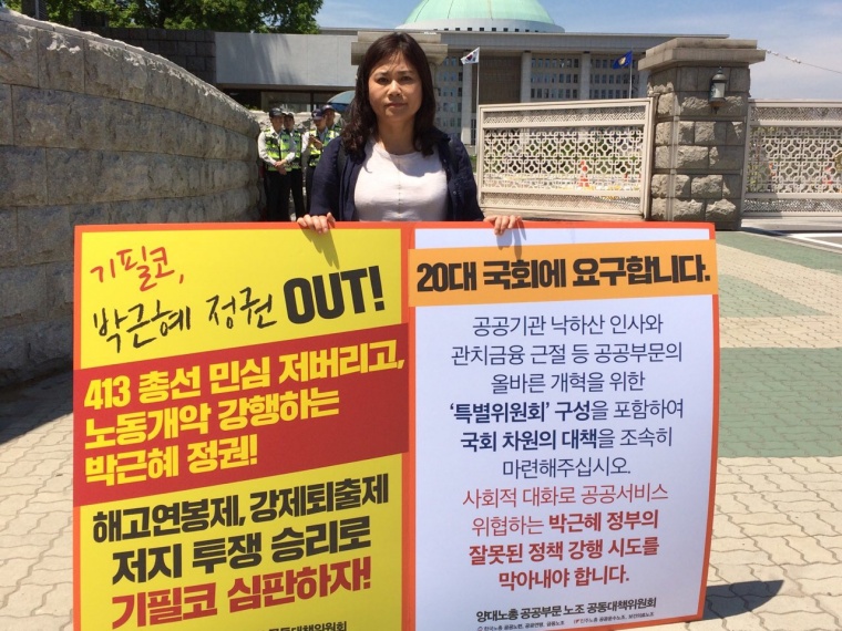 불법적 강압적 해고연봉제 및 강제 퇴출제 강제 도입 시도를 저지하기 위한 양대노총 공공부문노동조합 공동대책위원회가 여의도 국회(국민은행) 앞에서 천막 농성에 돌입한지 5일째를 맞는 15일, 빗속에서도 농성이 계속되고 있다. 천막농성은 노정교섭 마련을 위한 20대 국회의 역할을 촉구하며 양대노총 공공부문공대위 비상 상황실로서의 역할을 담당하고 있다.