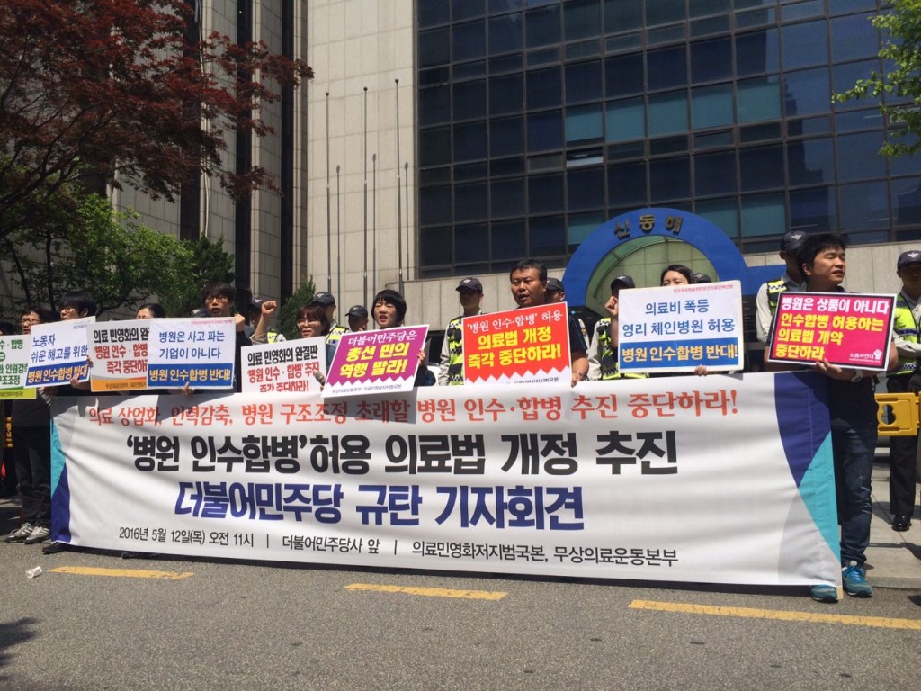 의료민영화저지범국본과 무상의료운동본부는 더불어민주당과 국민의당이 민의를 거슬러 합의한 병원 인수합병 법안 저지를 위해 지난 6일간 더민주당사에서 점거 농성을 하며 이를 저지하기 위한 투쟁을 전개했다.