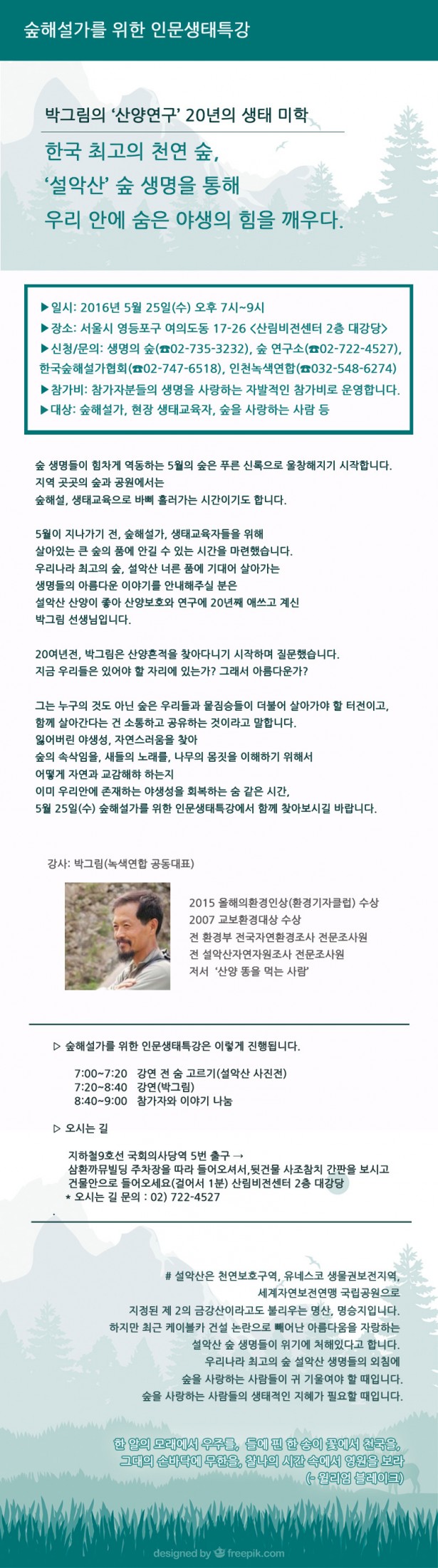 월, 2016/05/23- 18:38 에 익명 (미확인) 에 의해 제출됨 [0] 관련 개인/그룹 녹색연합 지역 성북구 생명의숲, 숲연구소, 한국숲해설가협회, 인천녹색연합이 숲해설가와 자연안내자, 숲을 사랑하는 사람들을 위한 인문생태특강 ‘설악산 생명을 통해 우리 안 야생의 힘을 깨우다’를... 링크 http://www.greenkorea.org/?p=53374 Tags 공지사항 녹색연합 설악산 설악산 오색케이블카 설악산 케이블카 반대 설악산국립공원지키기국민행동 숲해설가 숲해설가를 위한 인문생태특강 인문생태특강 Like 0 Dislike 0 252 views 댓글 달기 이름 제목 Comment 저장 Preview